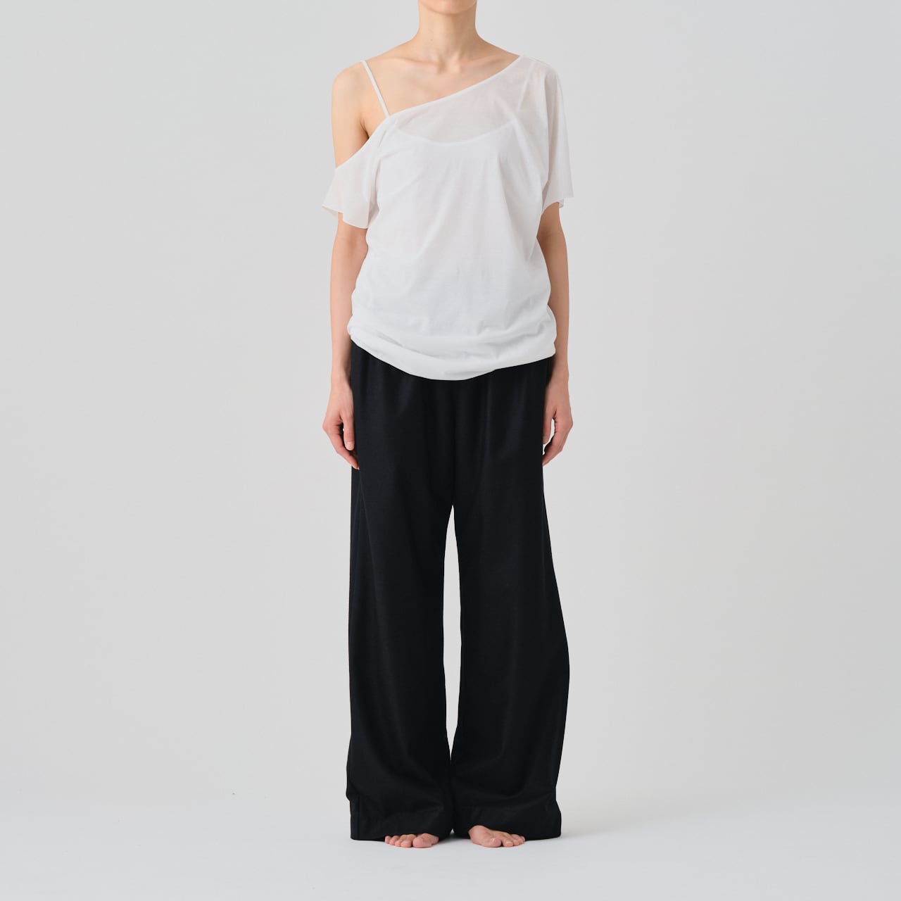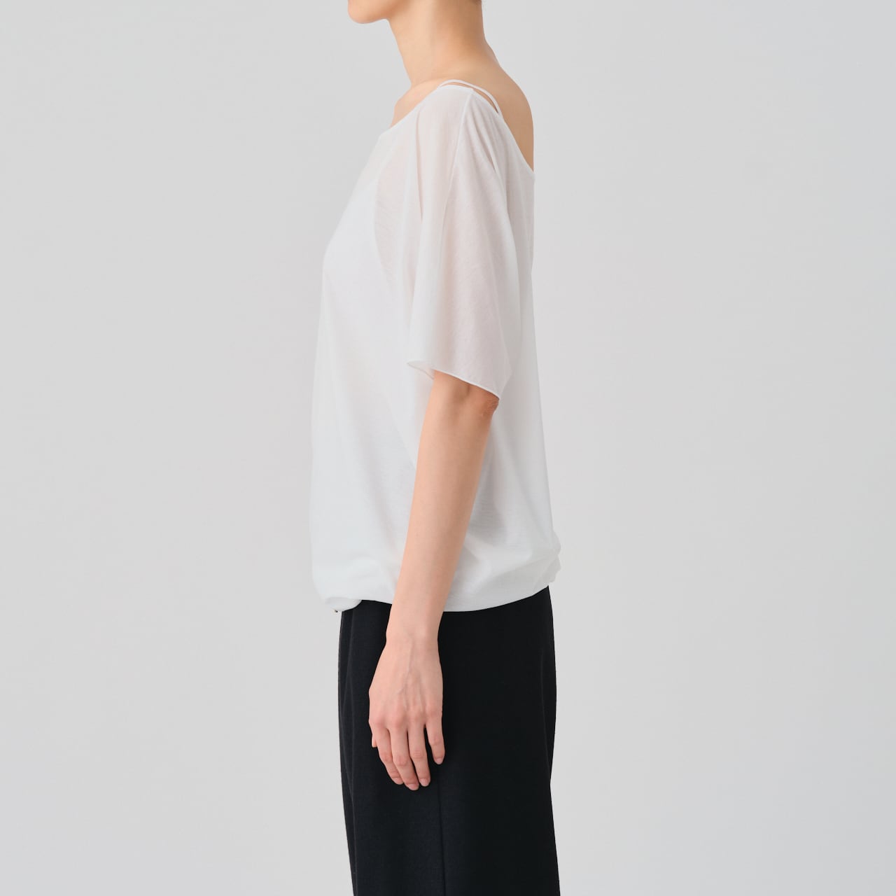 裾を折り返すことで、Tシャツをレイヤードしているかのようなニュアンスを生む、遊び心あるデザインです。シンプルながらスタイリングに奥行きをもたらし、一枚でも変化のある着こなしが楽しめるアイテムです。