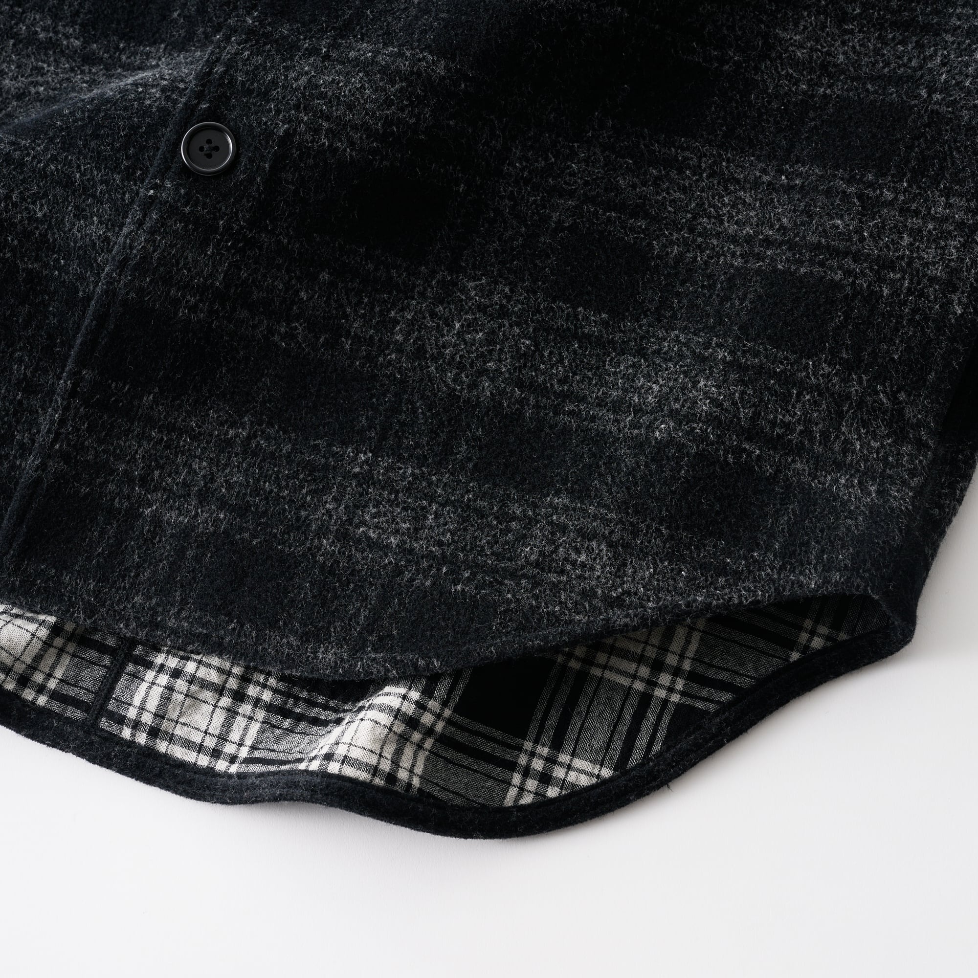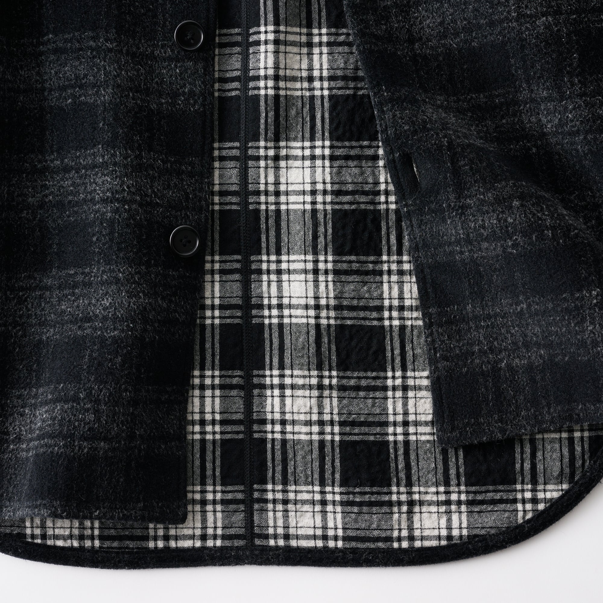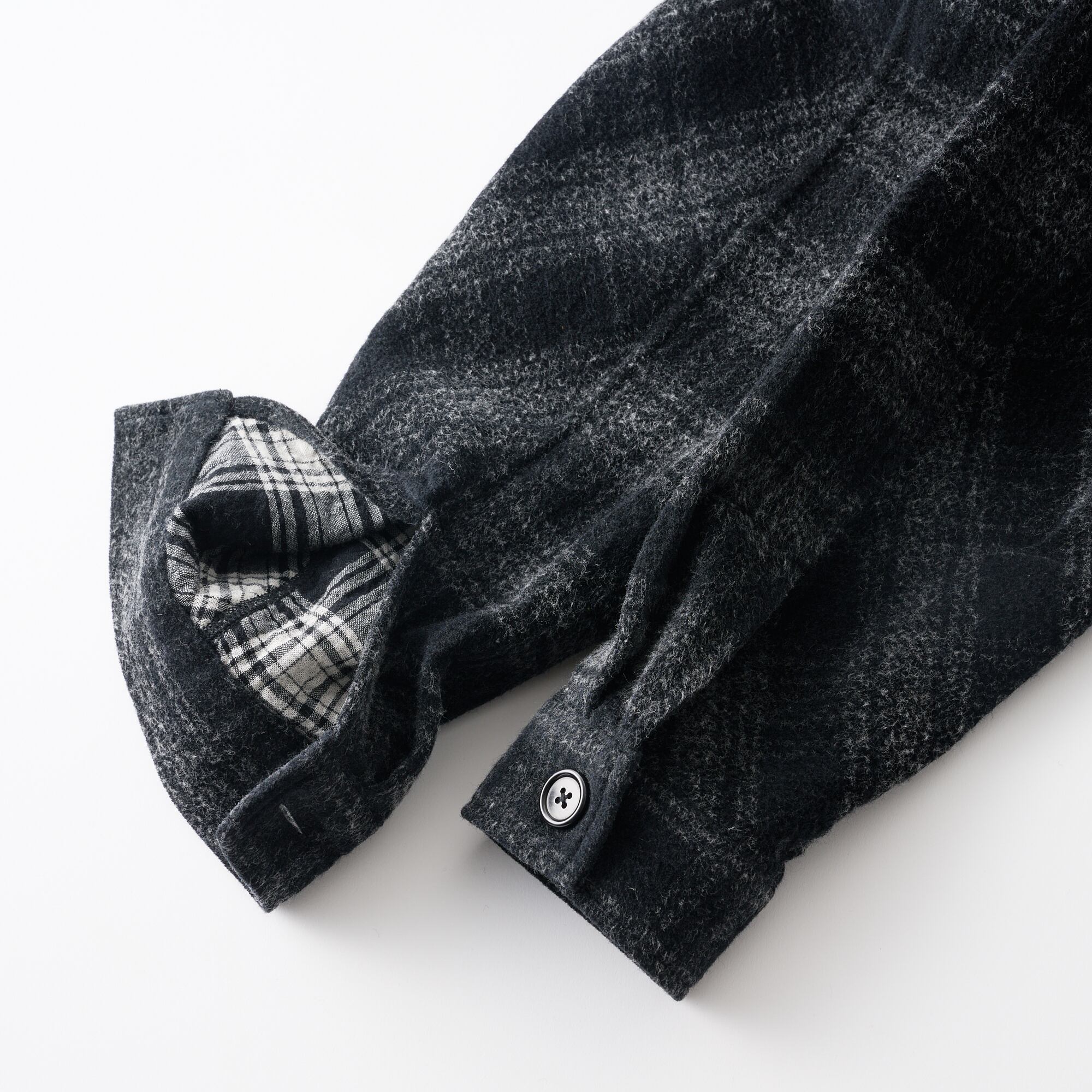 Needle punching is a rare traditional technique in which the fibers of two different fabrics are intertwined and crimped together using a needle like a swordsmith's mallet, and is performed by skilled craftsmen. The fabrics used are a checkered wool gauze that is so thin and light that it is transparent, and a plain jersey velour that has elasticity. In the process of processing, the checkered pattern is made to appear on the plain velour, creating a unique expression. The fabric is made surprisingly lightweight and warm by softly airing it out.