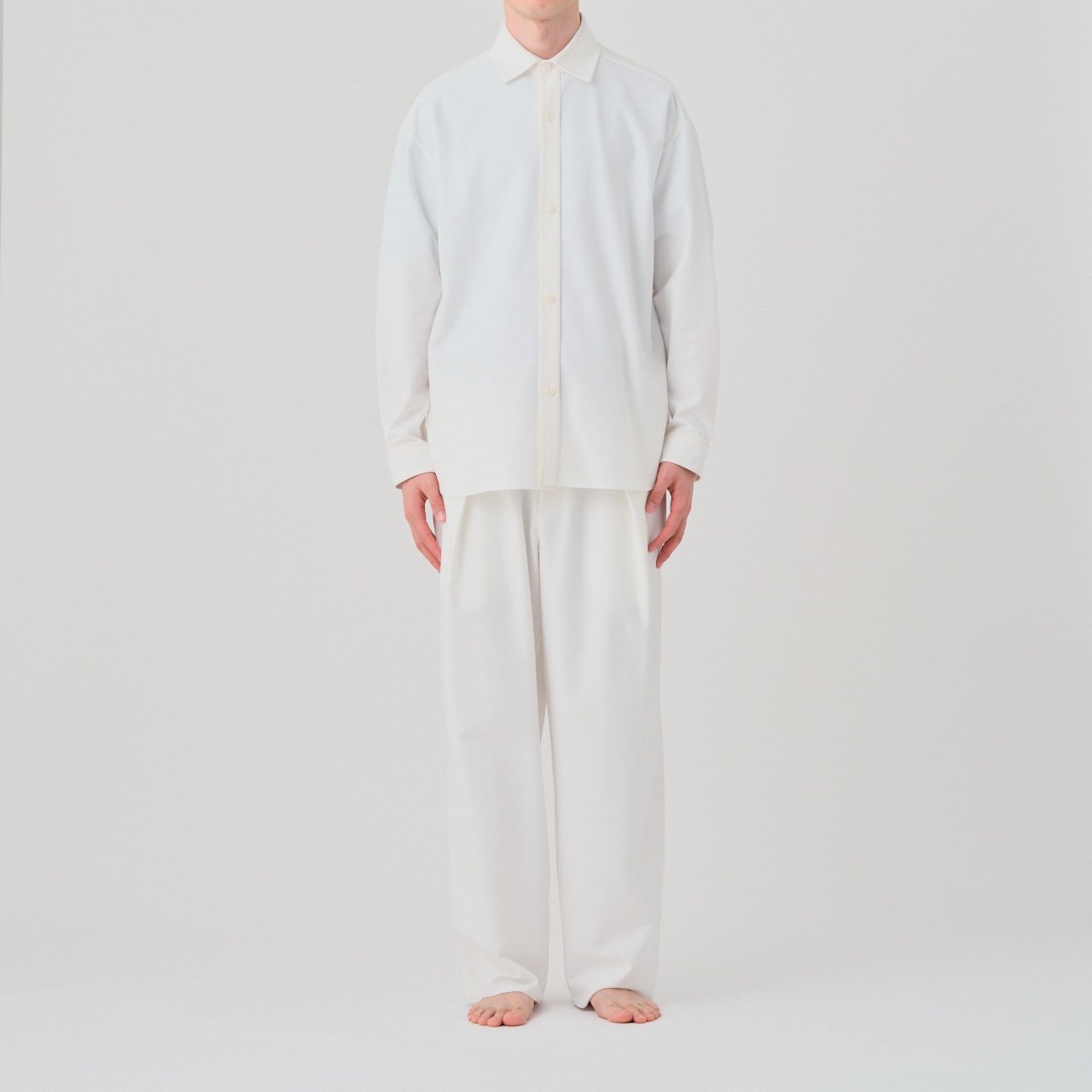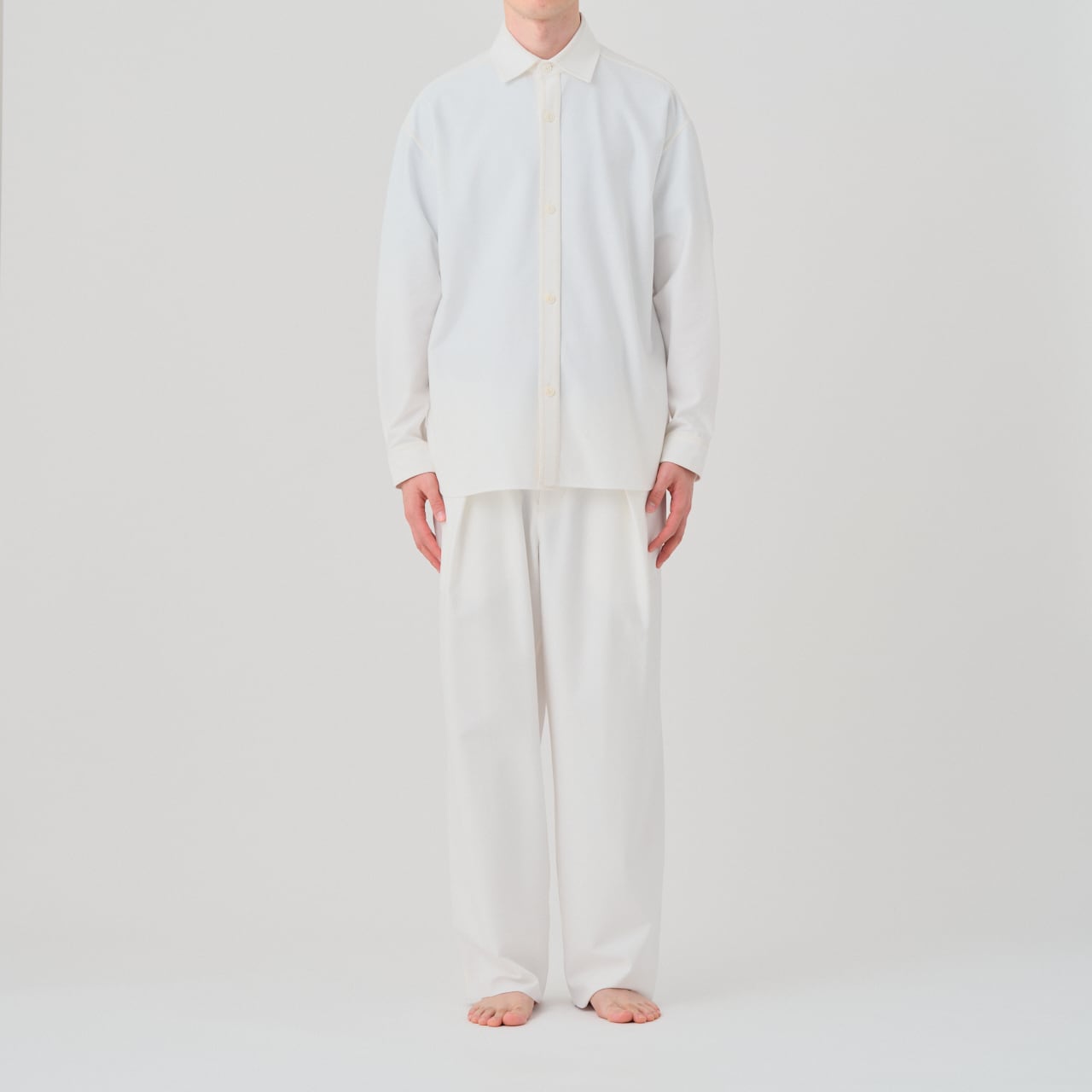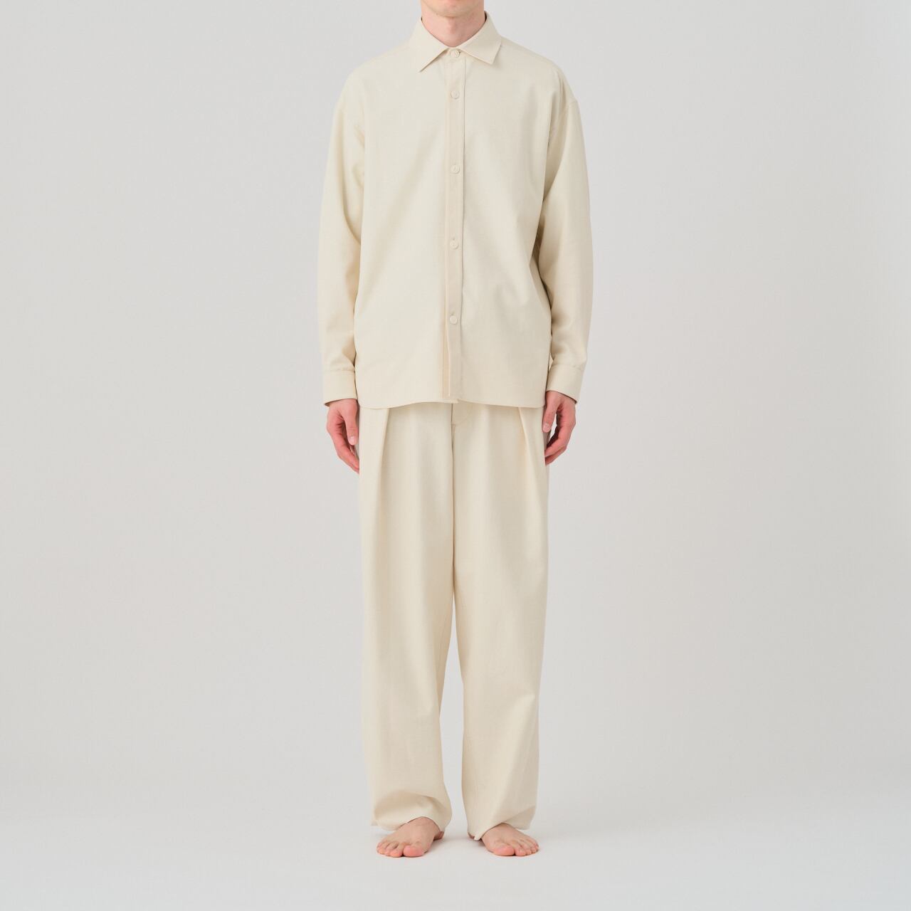 微配色の太番手による特別なステッチを施し、大胆さと繊細さを併せ持つオーバーシャツは、01-01-1828 Color Stitch One Tuck Straight Pantsとセットアップとしてもお召いただけます。