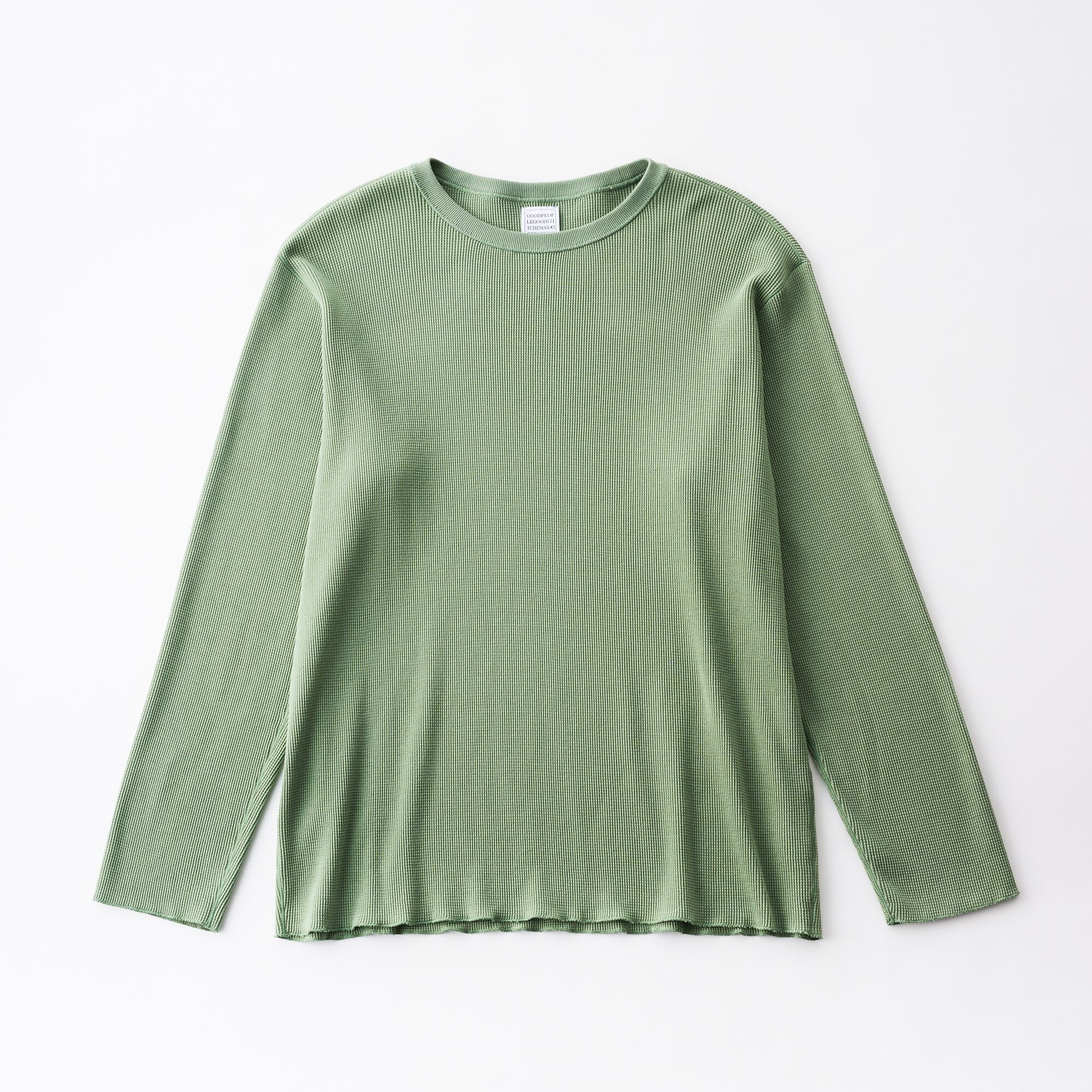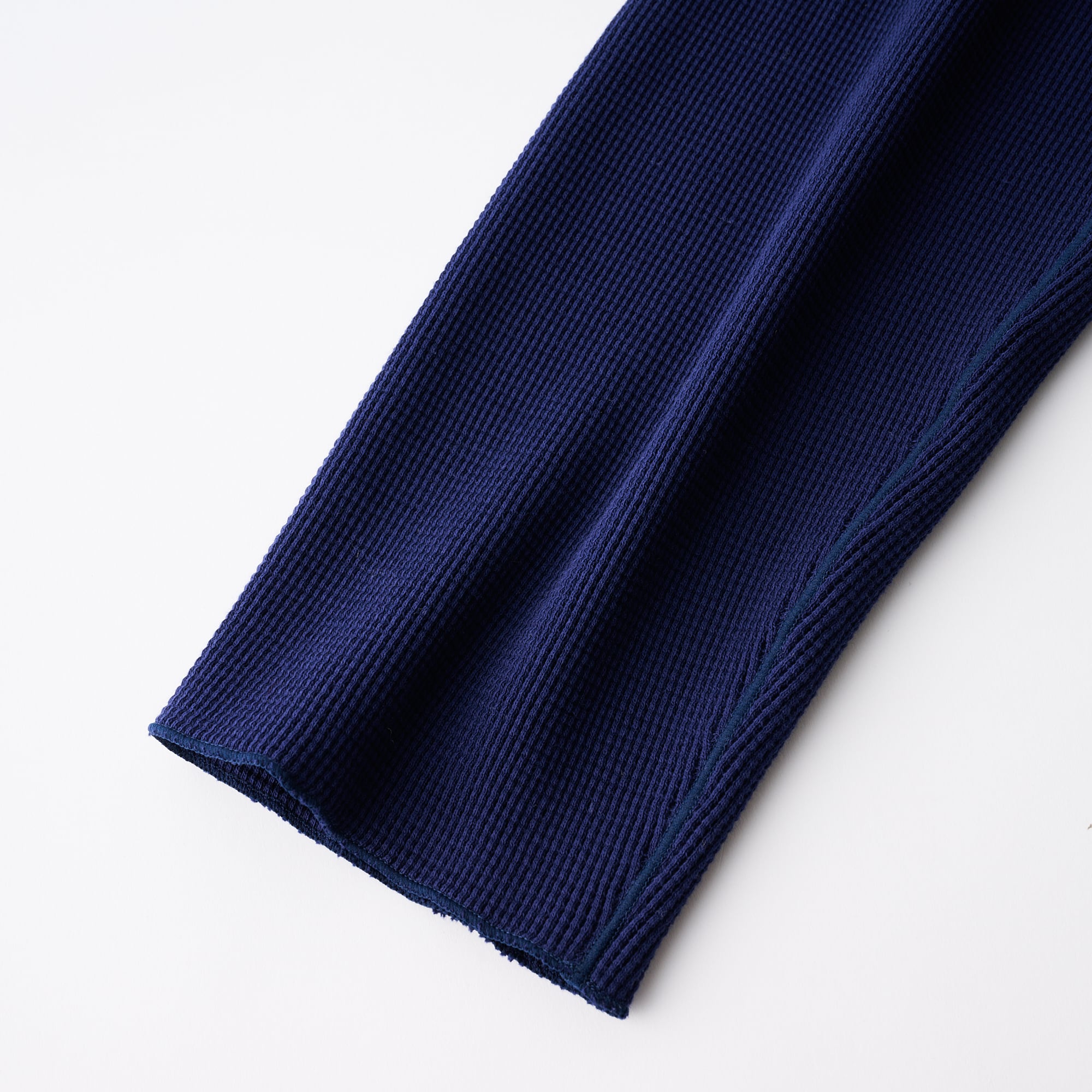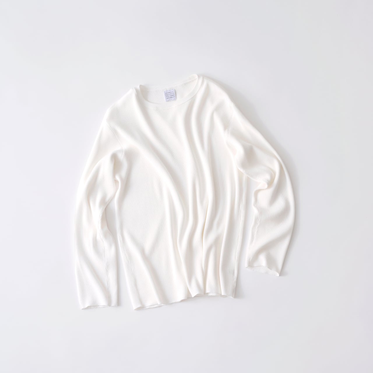 Using rare organic long-staple cotton and yarn with the perfect thickness of 48/2, it provides just the right thickness for a thermal while maintaining a light and airy texture. Additionally, it features a soft touch against the skin, thanks to the low-pile, gently twisted yarn.