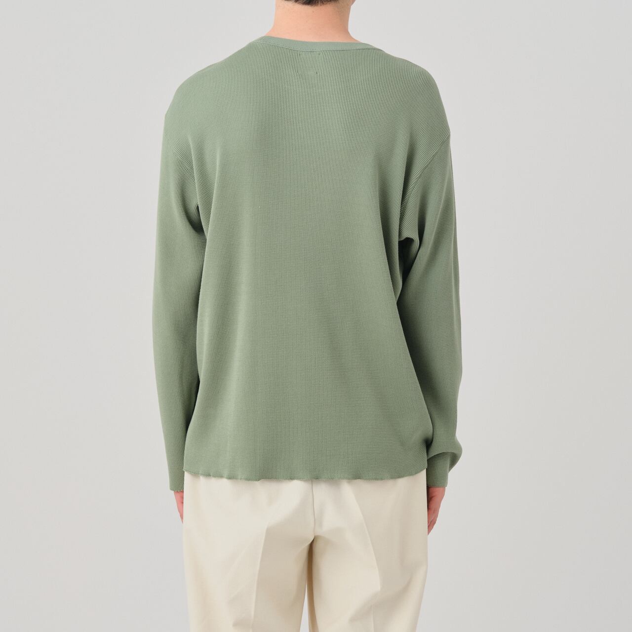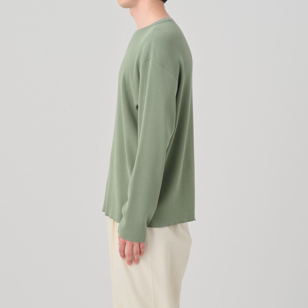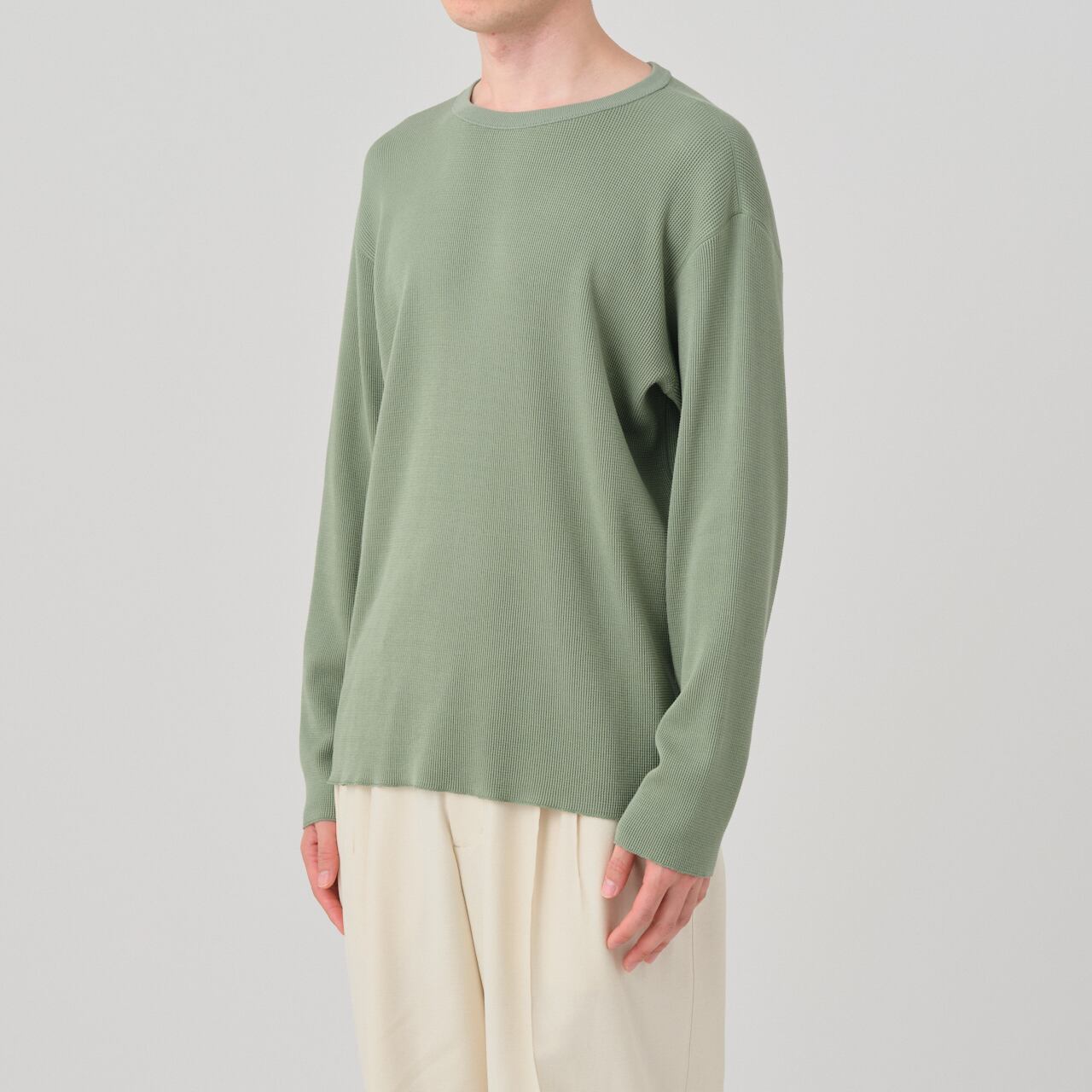 ワッフル素材のクルーネックロングスリーブプルオーバー。