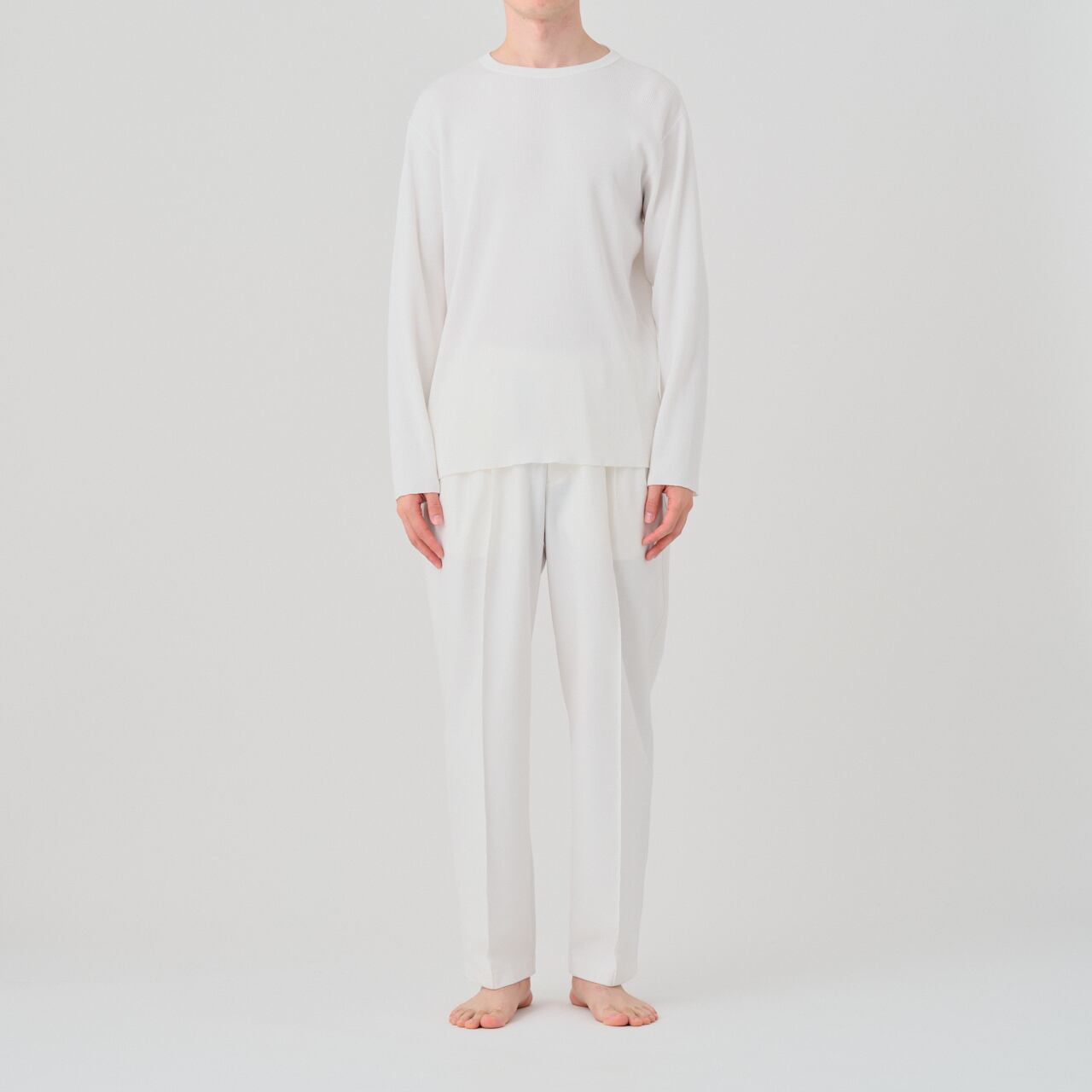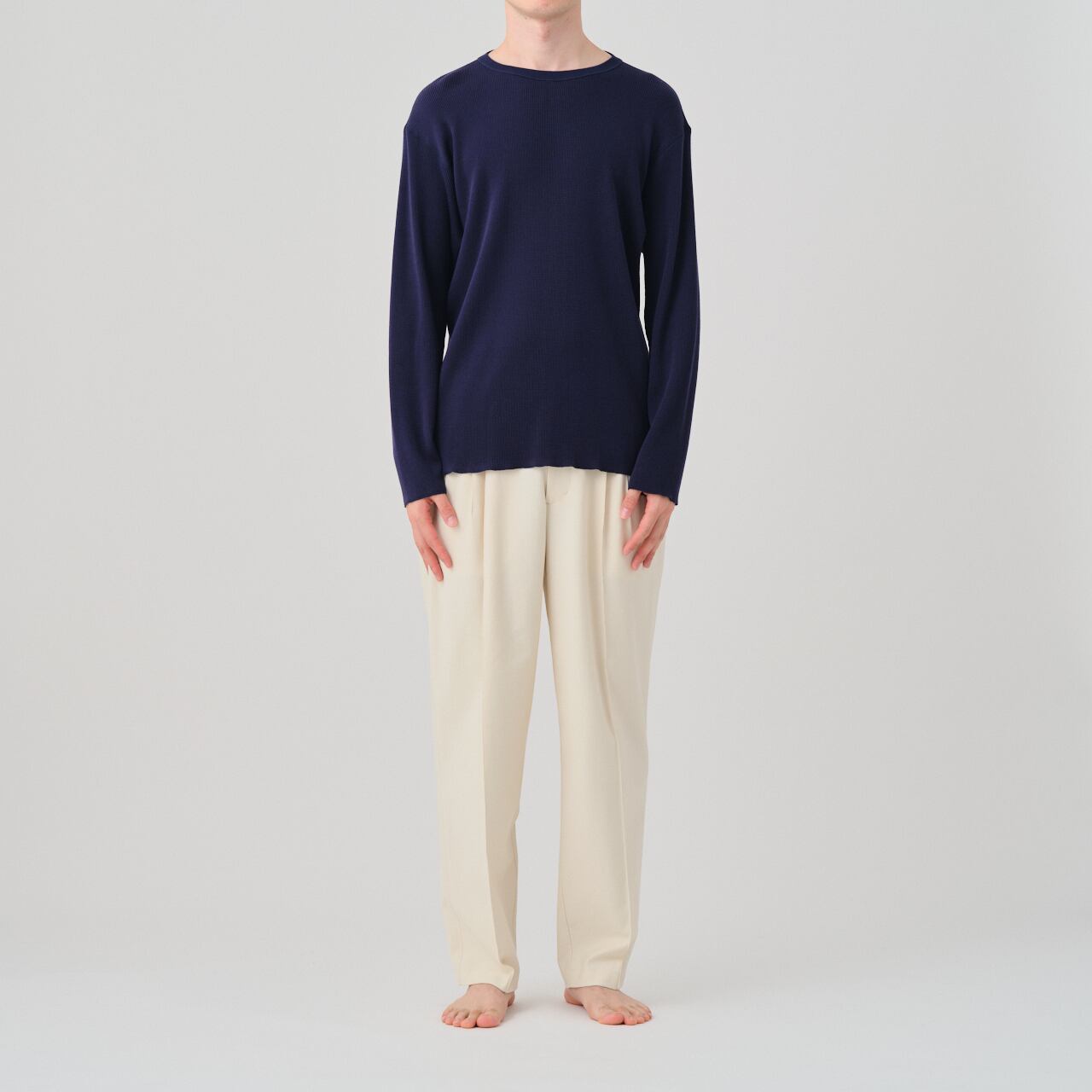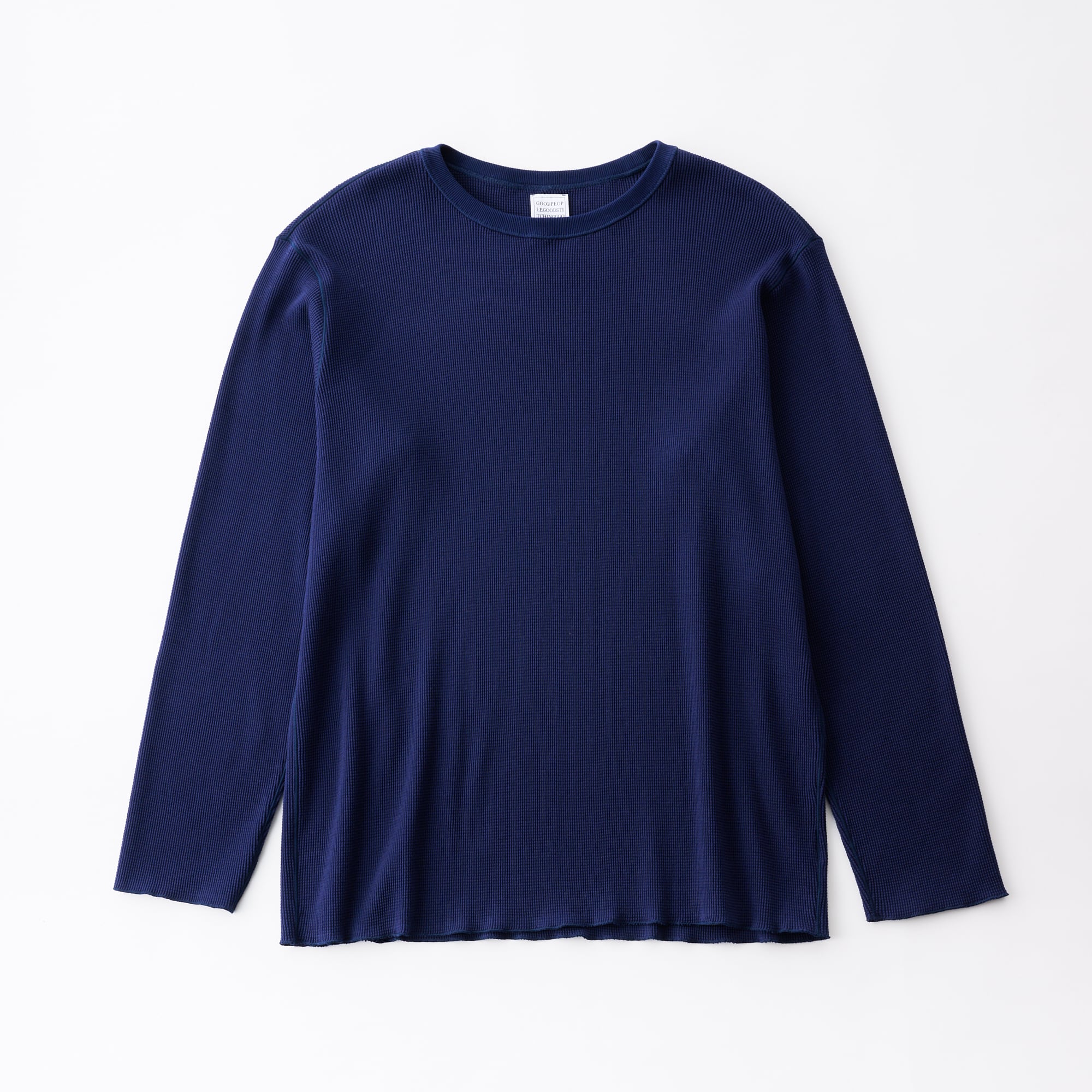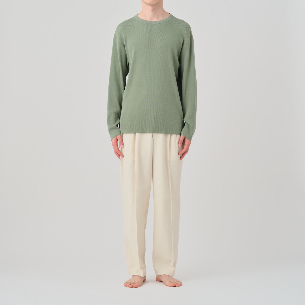 ワッフル素材のクルーネックロングスリーブプルオーバー。