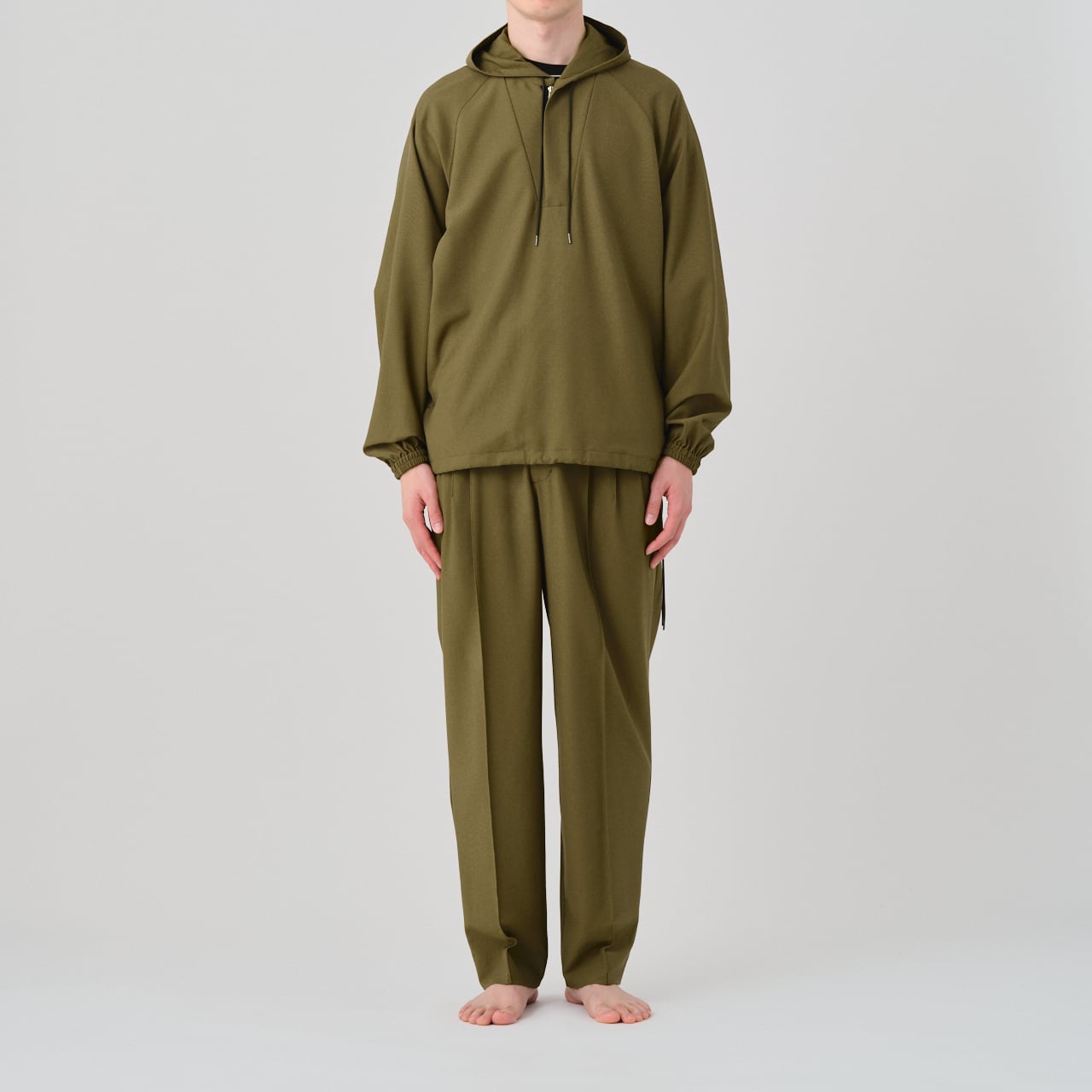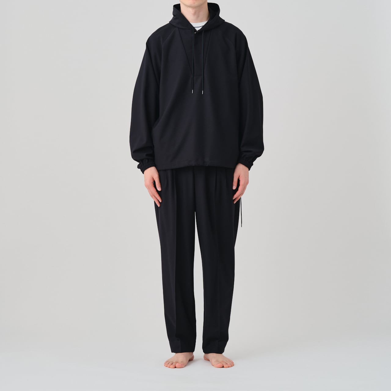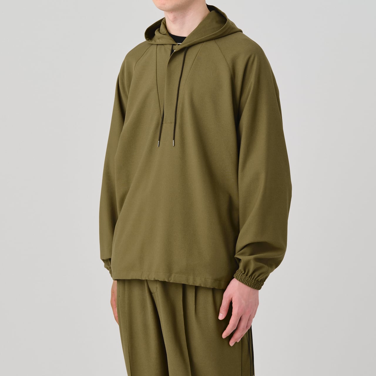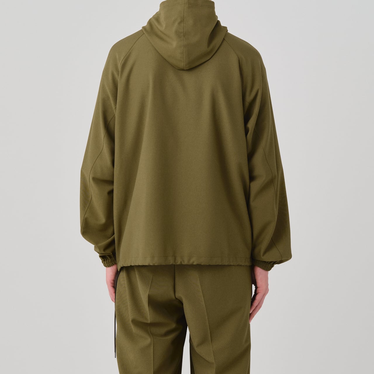 スポーティーな印象ながらも軽やかな着心地と上品な光沢が特徴のアノラックは、01-01-1809 3 Tuck Drawstring Easy Pantsや、01-01-1811 Tuck Tailored Pantsとのセットアップでもお召いただけます。