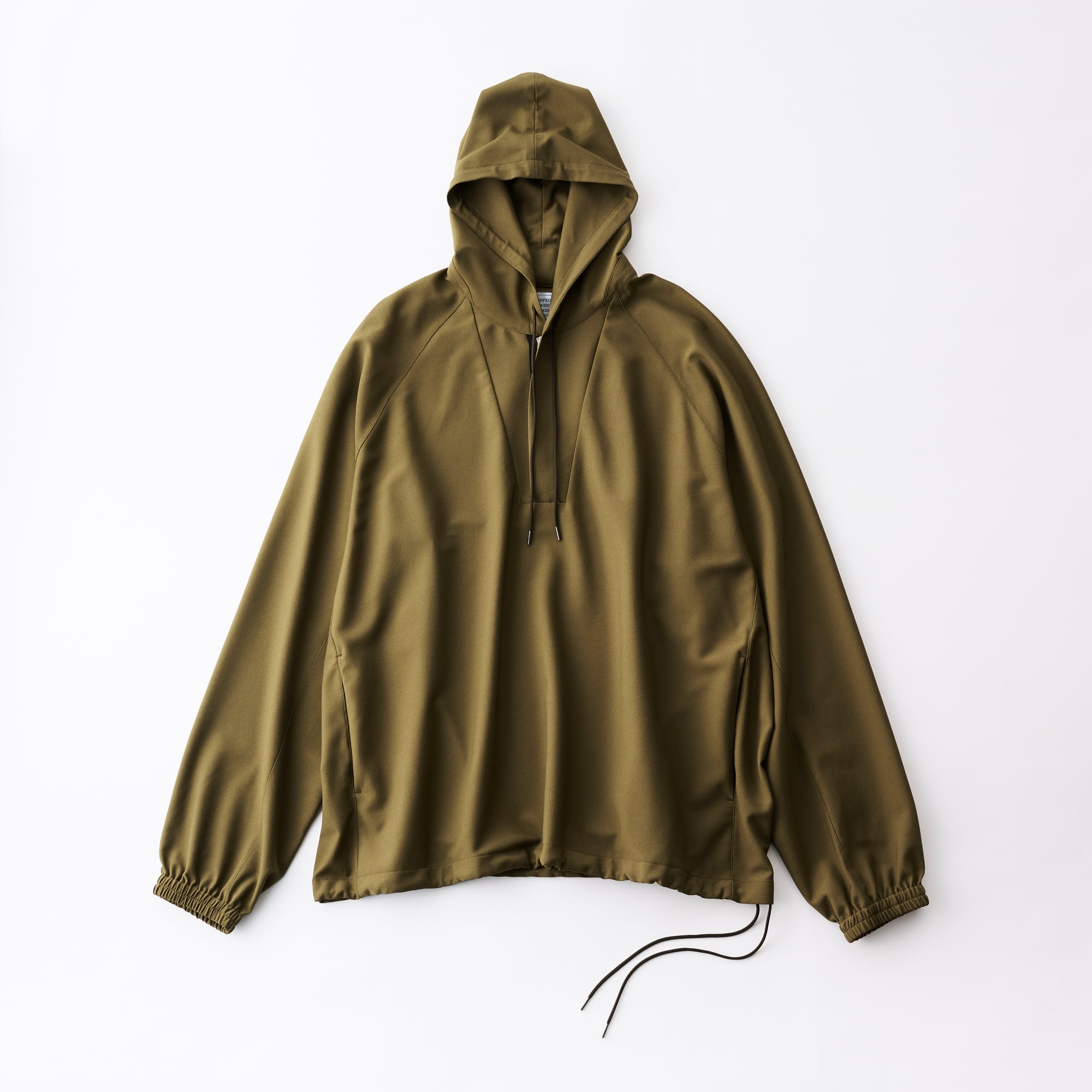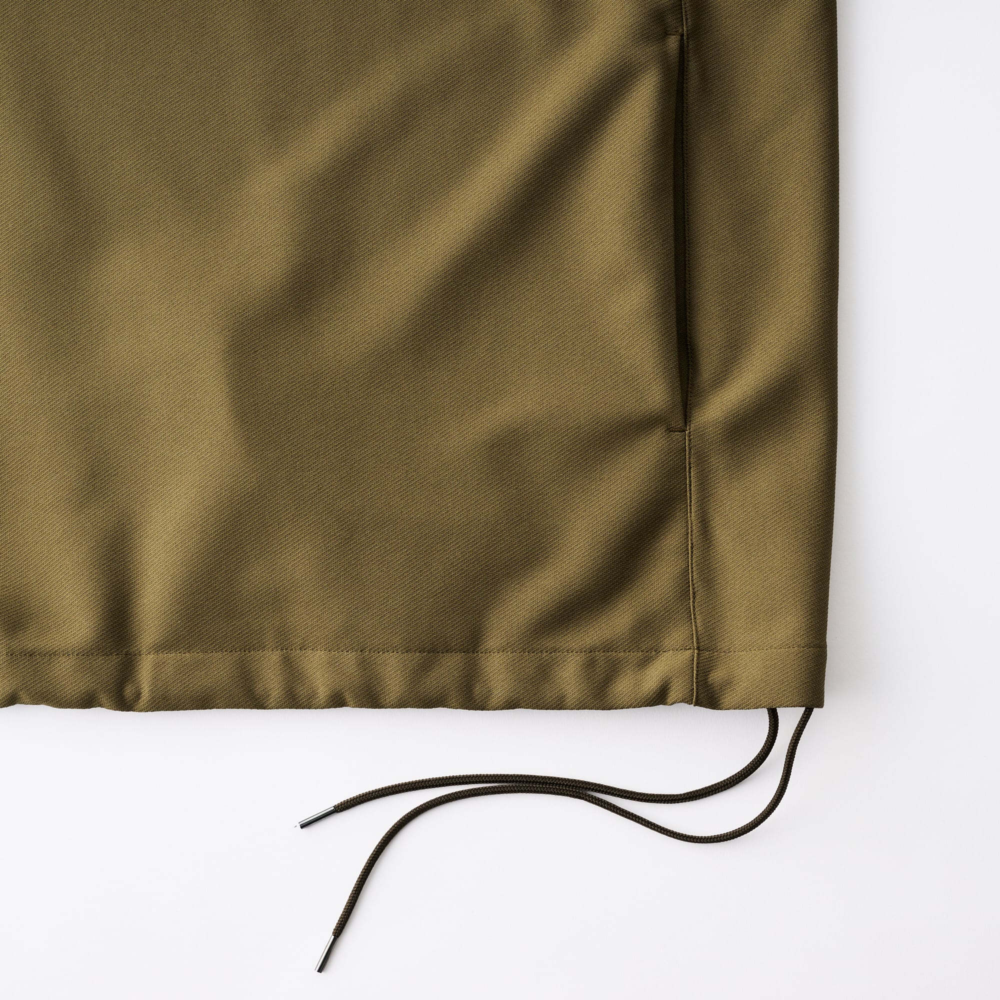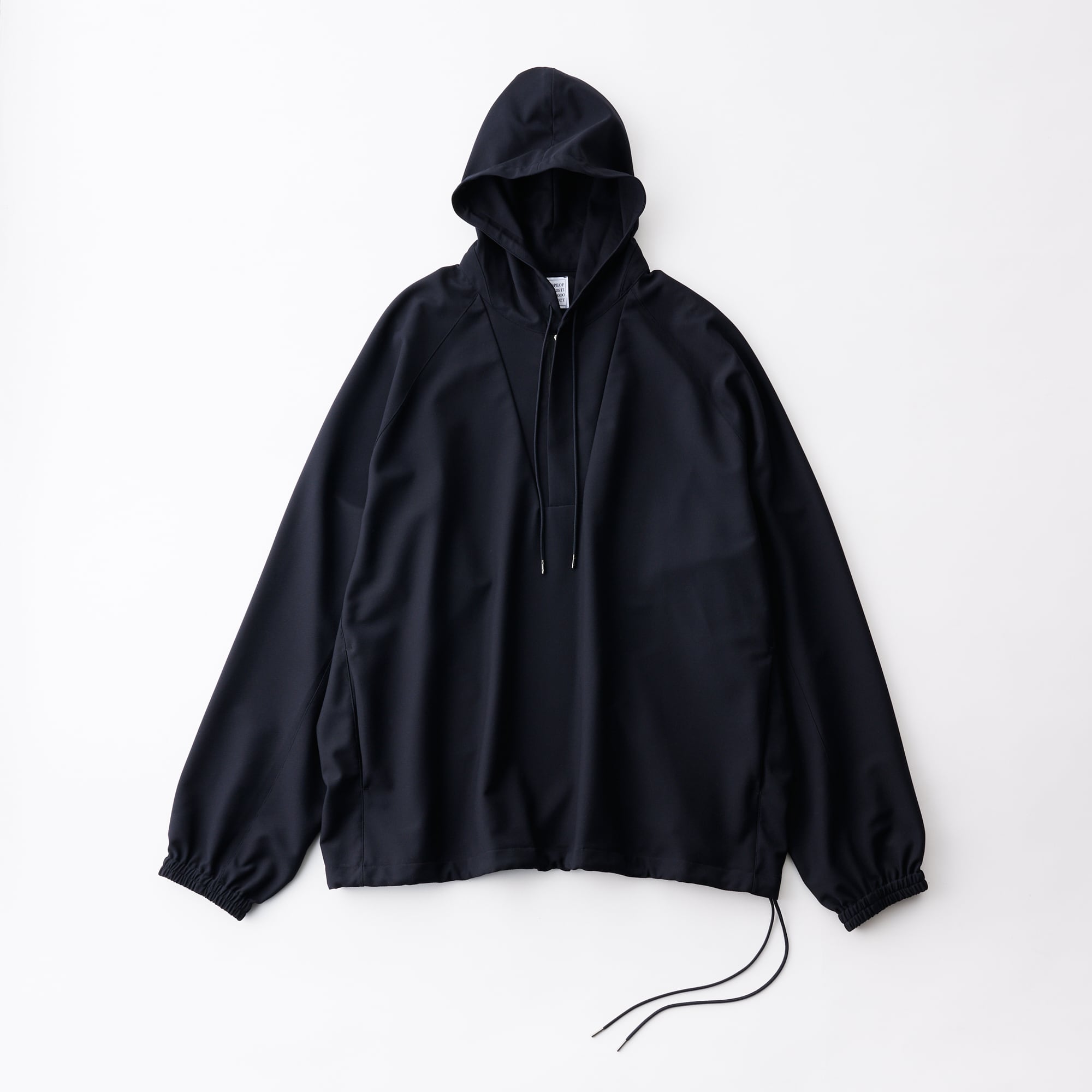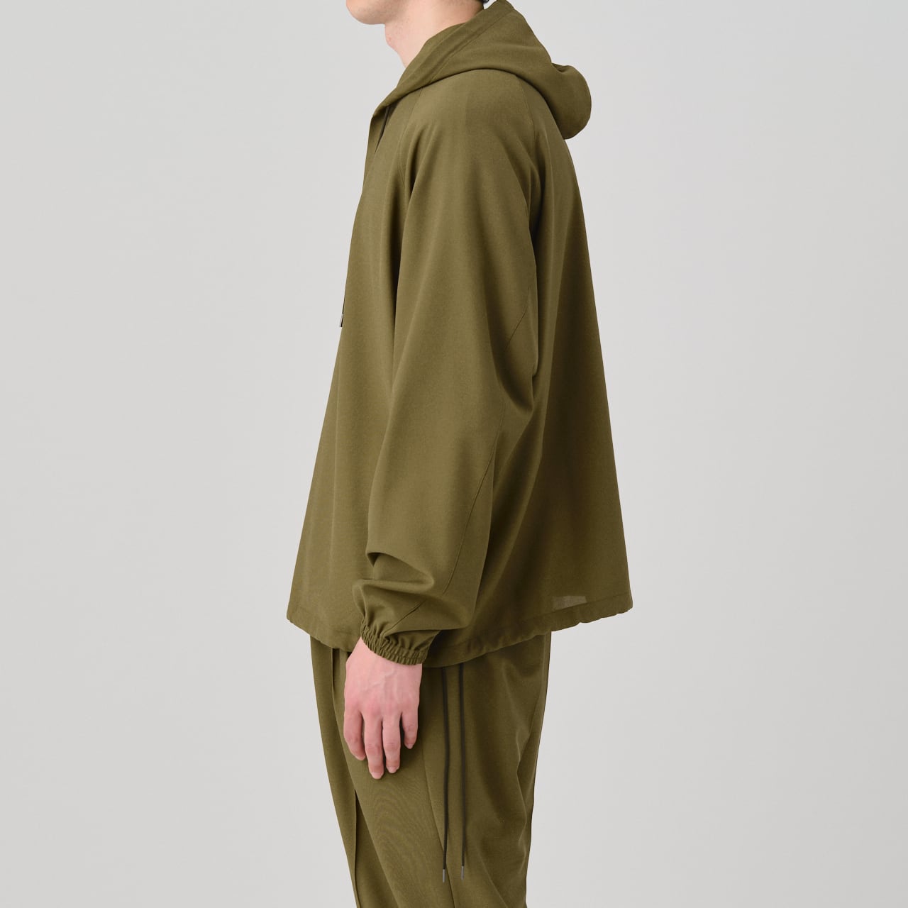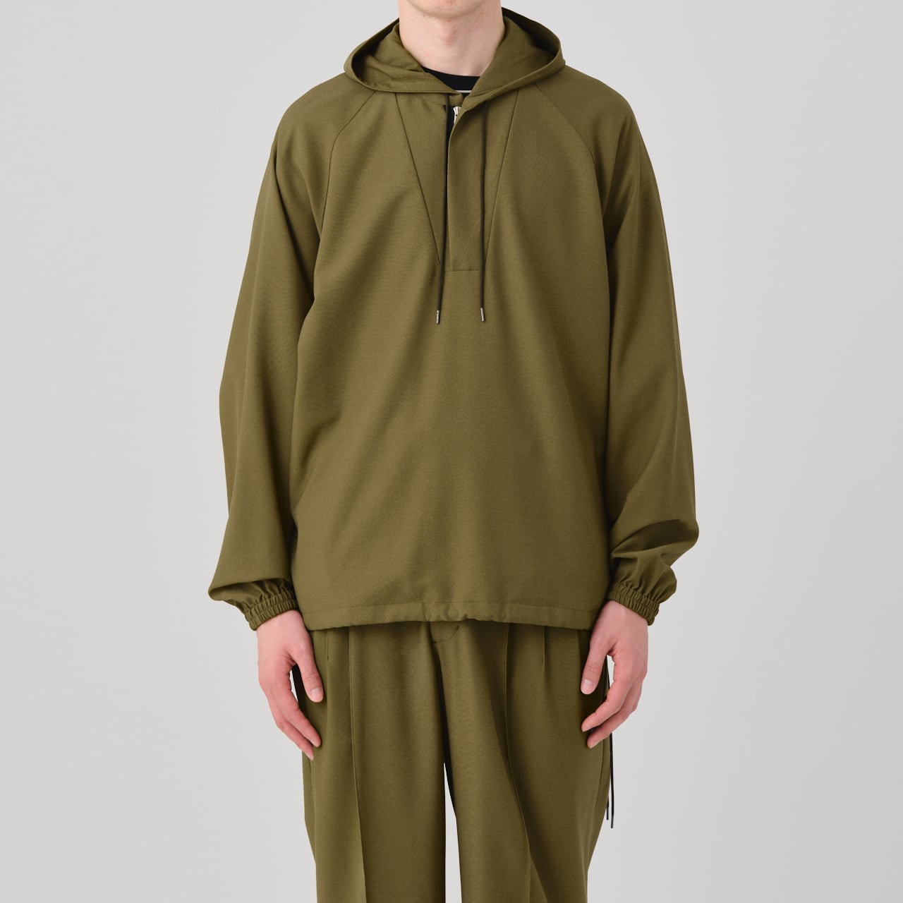 This anorak, with its sporty impression, lightweight feel, and elegant sheen, can be paired as a set with the 01-01-1809 3 Tuck Drawstring Easy Pants or the 01-01-1811 Tuck Tailored Pants.