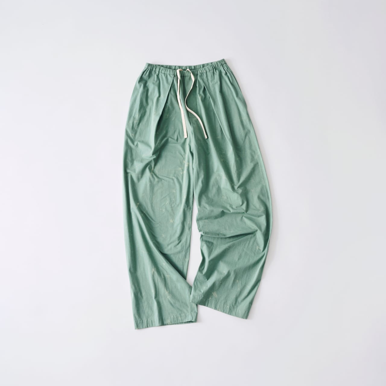 日本の伝統技法、ロウケツ染のリラックスシルエット、イージーパンツ。