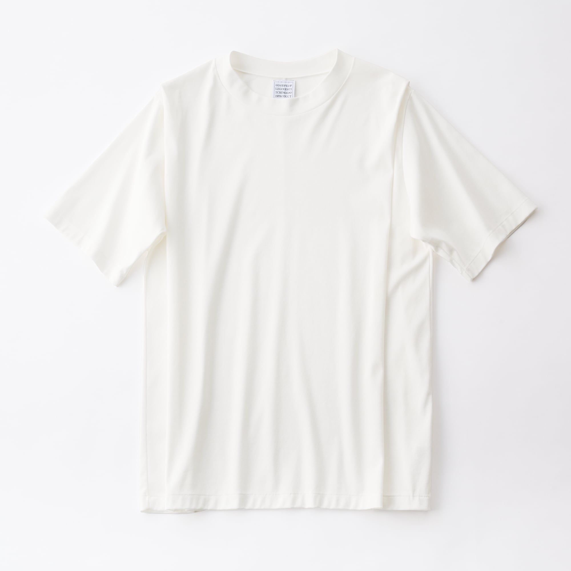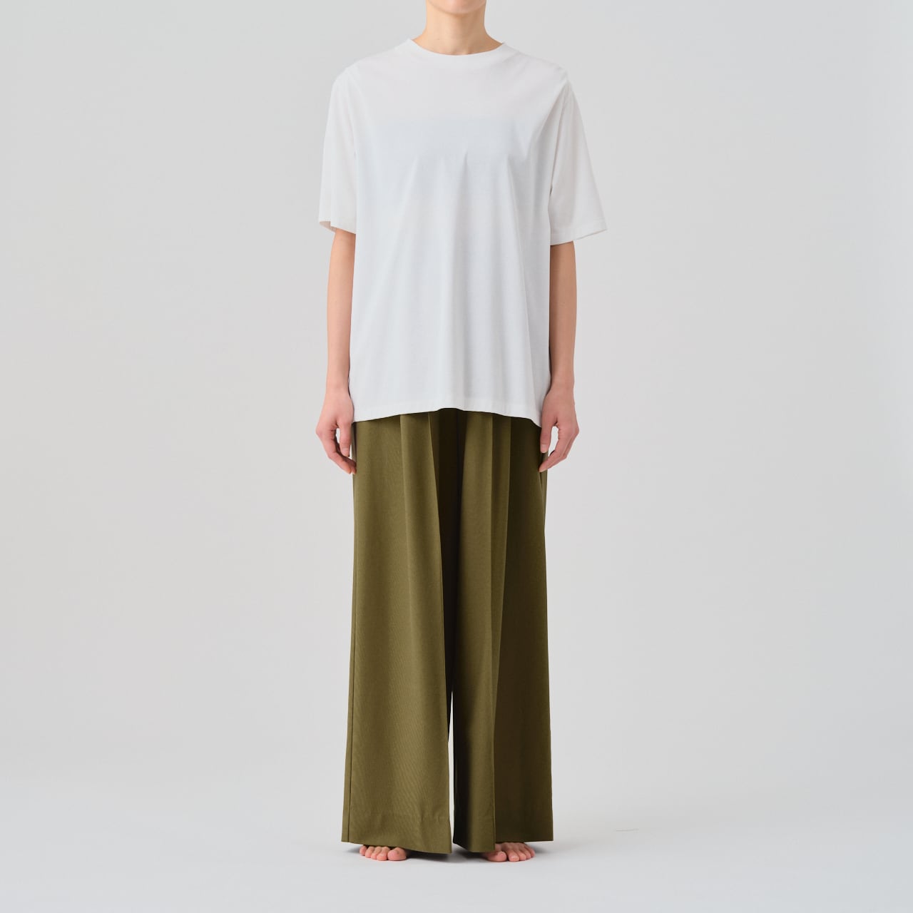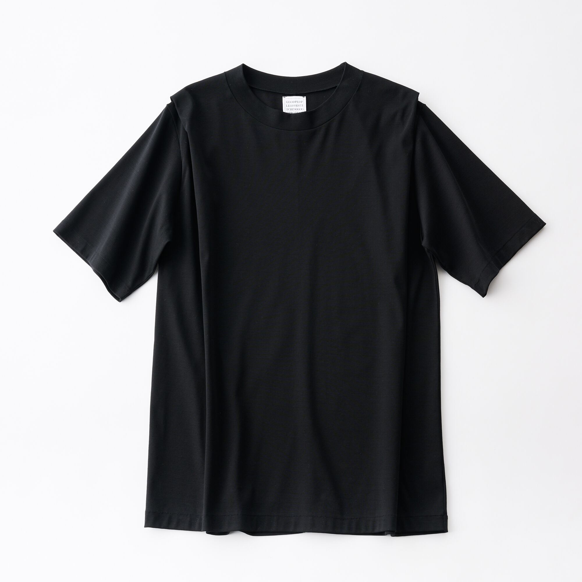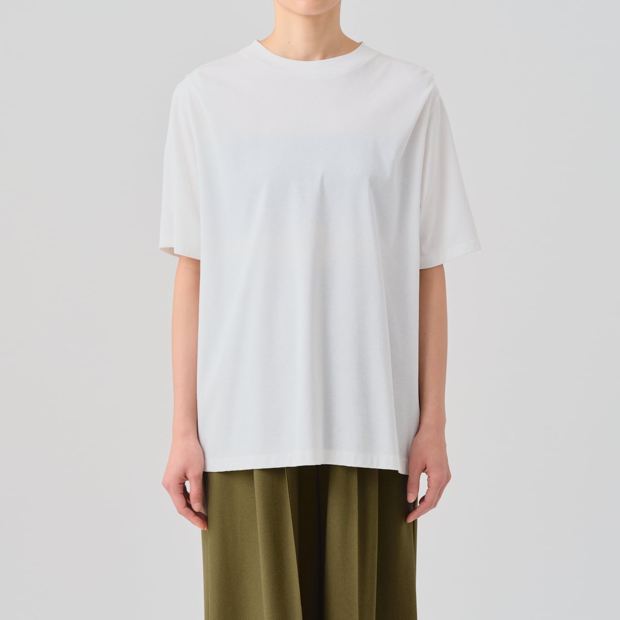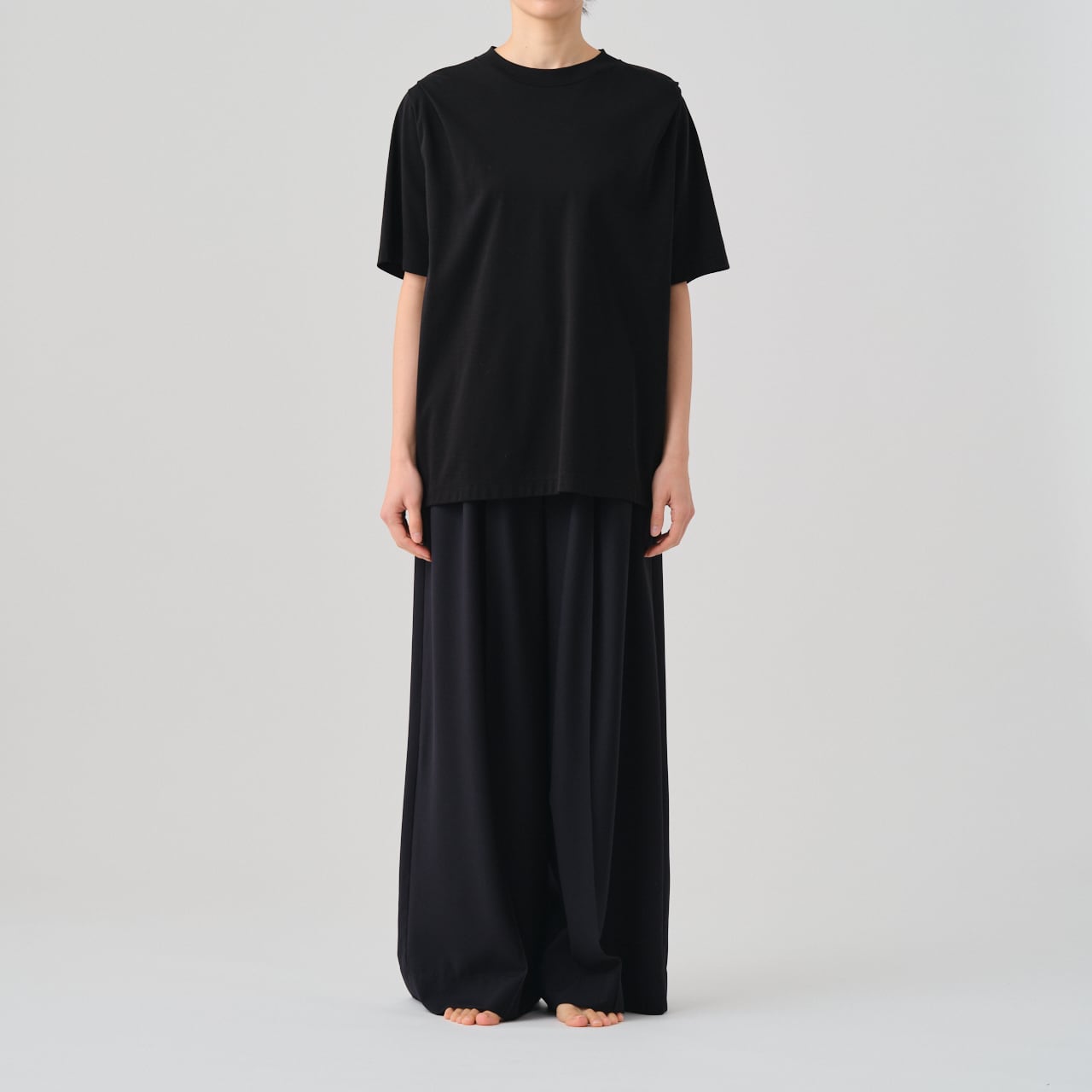 ハイゲージフライス素材の、肩にプリーツの入ったクルーネックショートスリーブT。