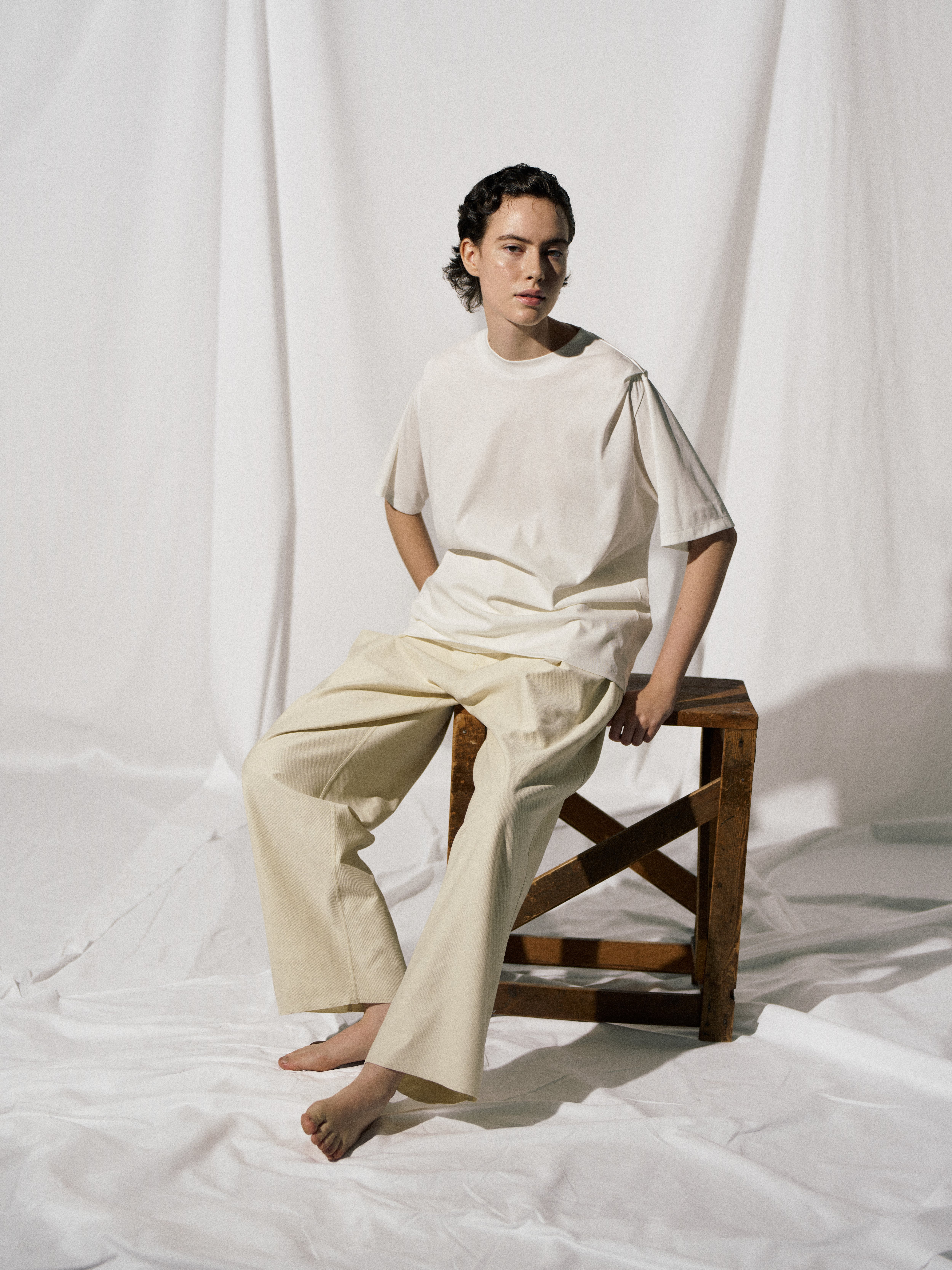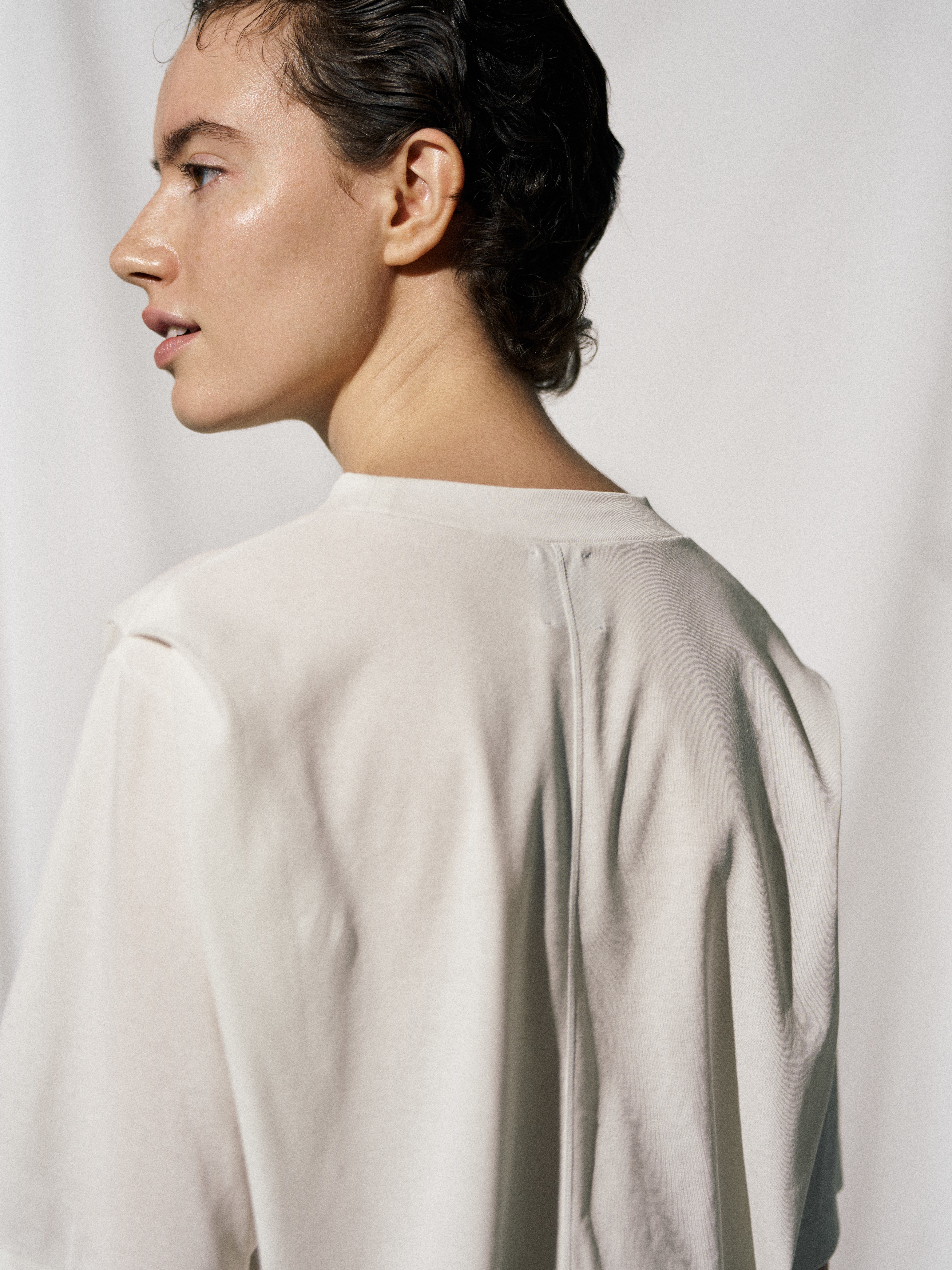 Crewneck short sleeve T-shirt made of high-gauge milling material with pleats on the shoulders.