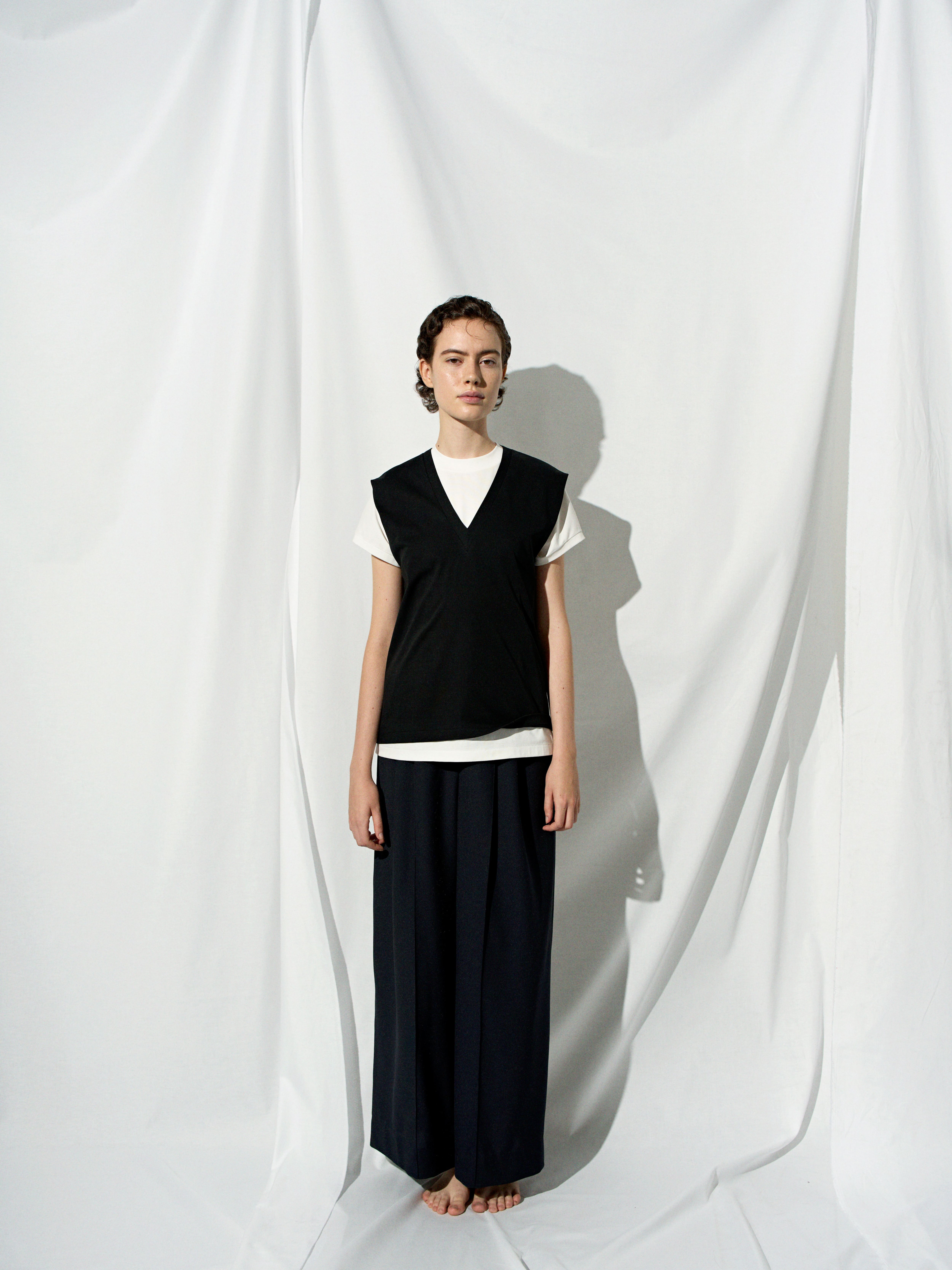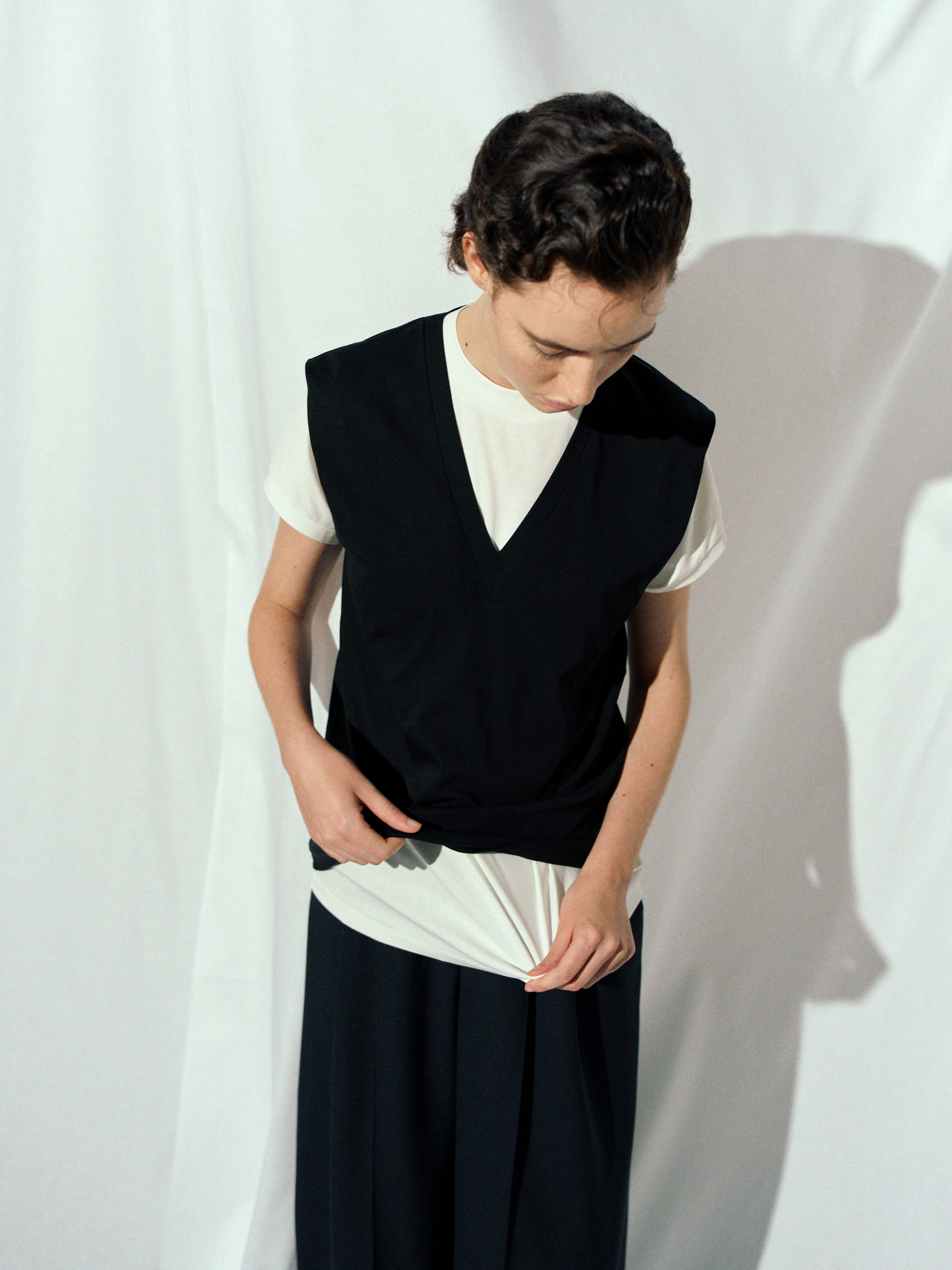 GGG's new standard ribbed knit material uses a high-gauge knitting machine, resulting in a fabric that is dense yet stretchy, minimally sheer, and comfortable with low stress. By using low-fuzz high-twist yarn, it achieves a silky, dry touch finish.