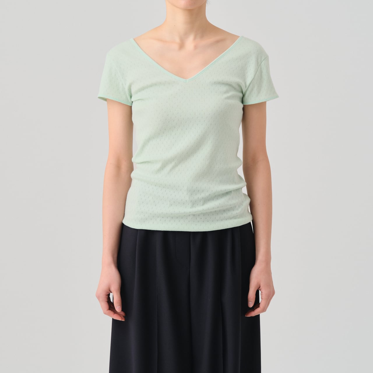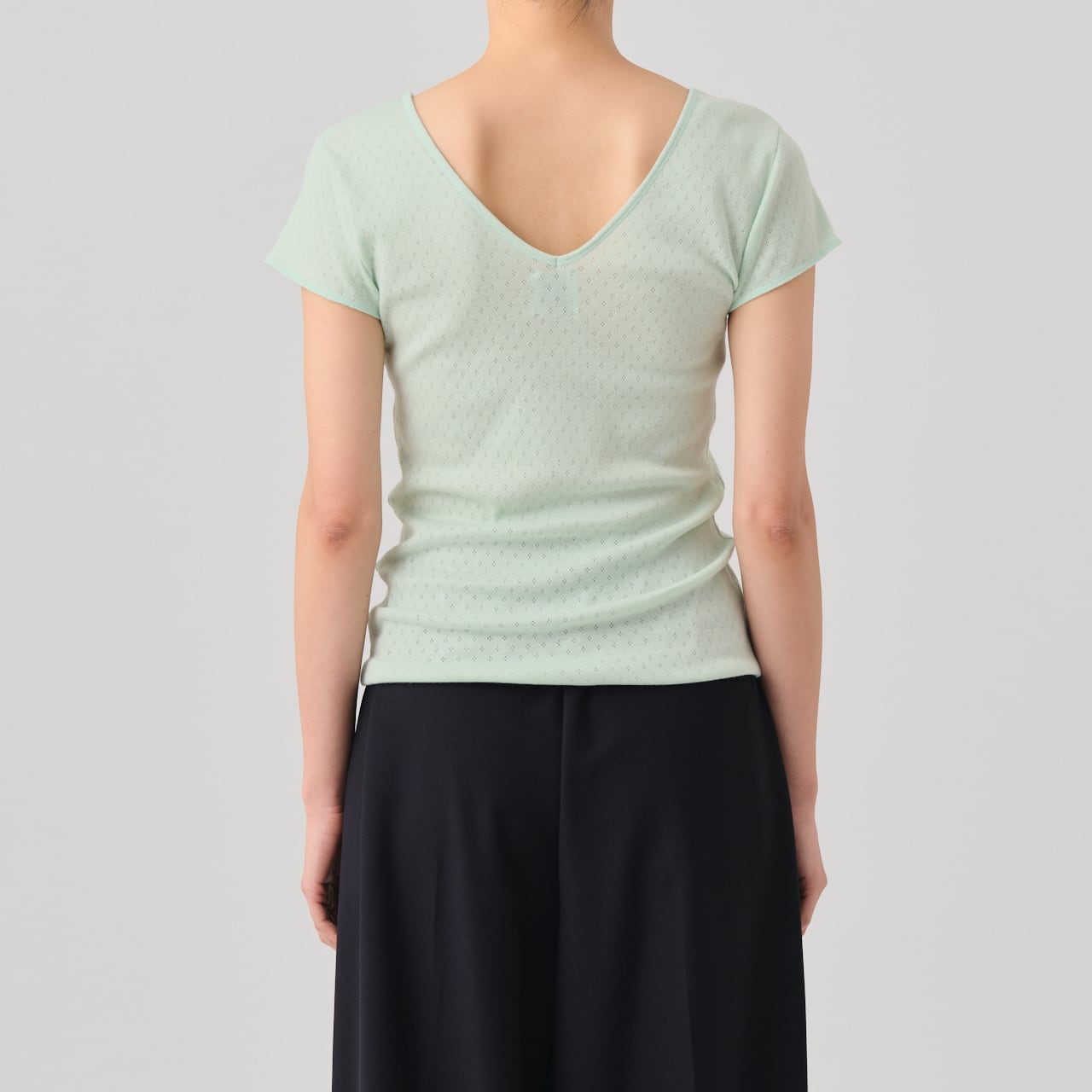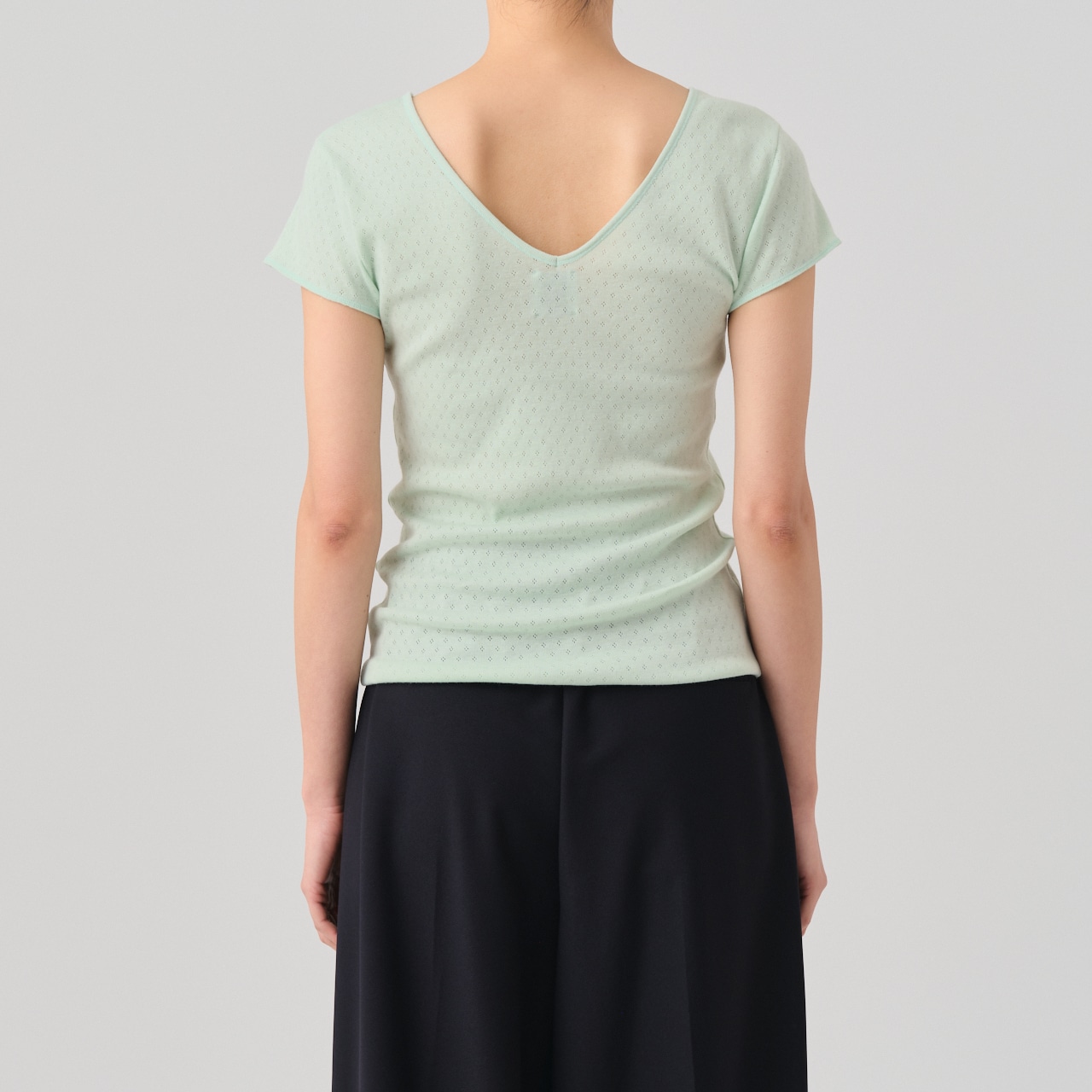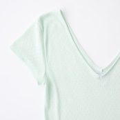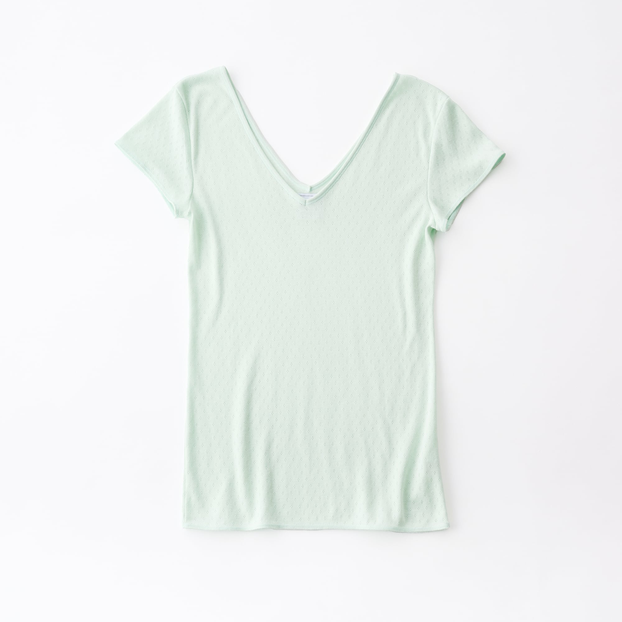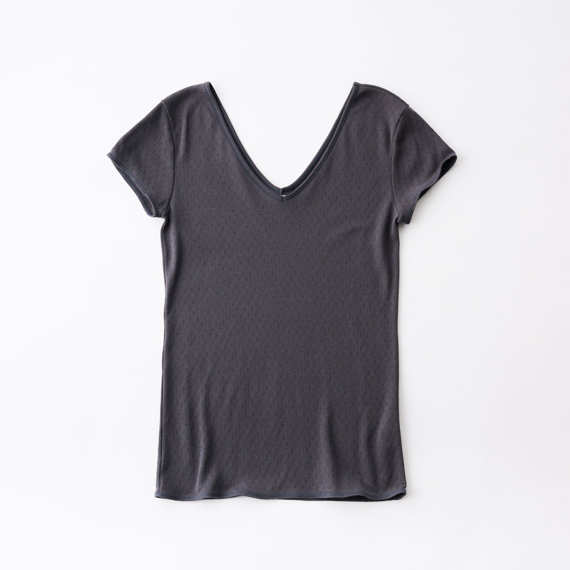 The cap-sleeve T with a retro-style patterned mesh can also be enjoyed as an ensemble with the 02-01-1860 Cotton Silk Double V Neck Camisole made from the same material.