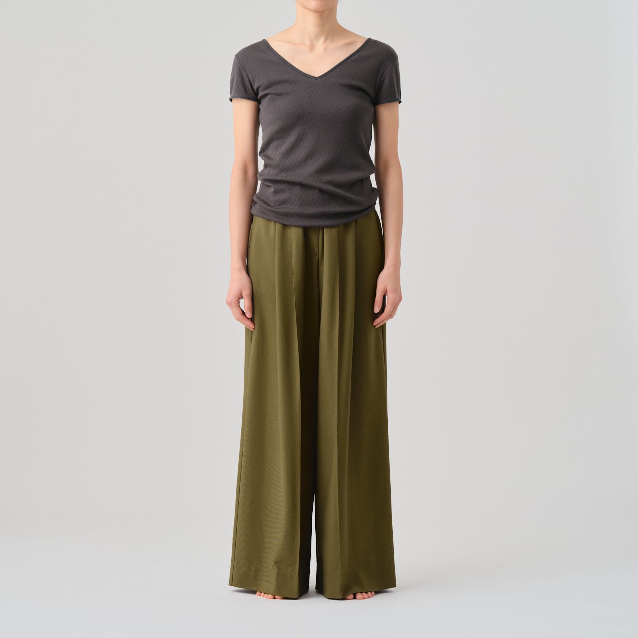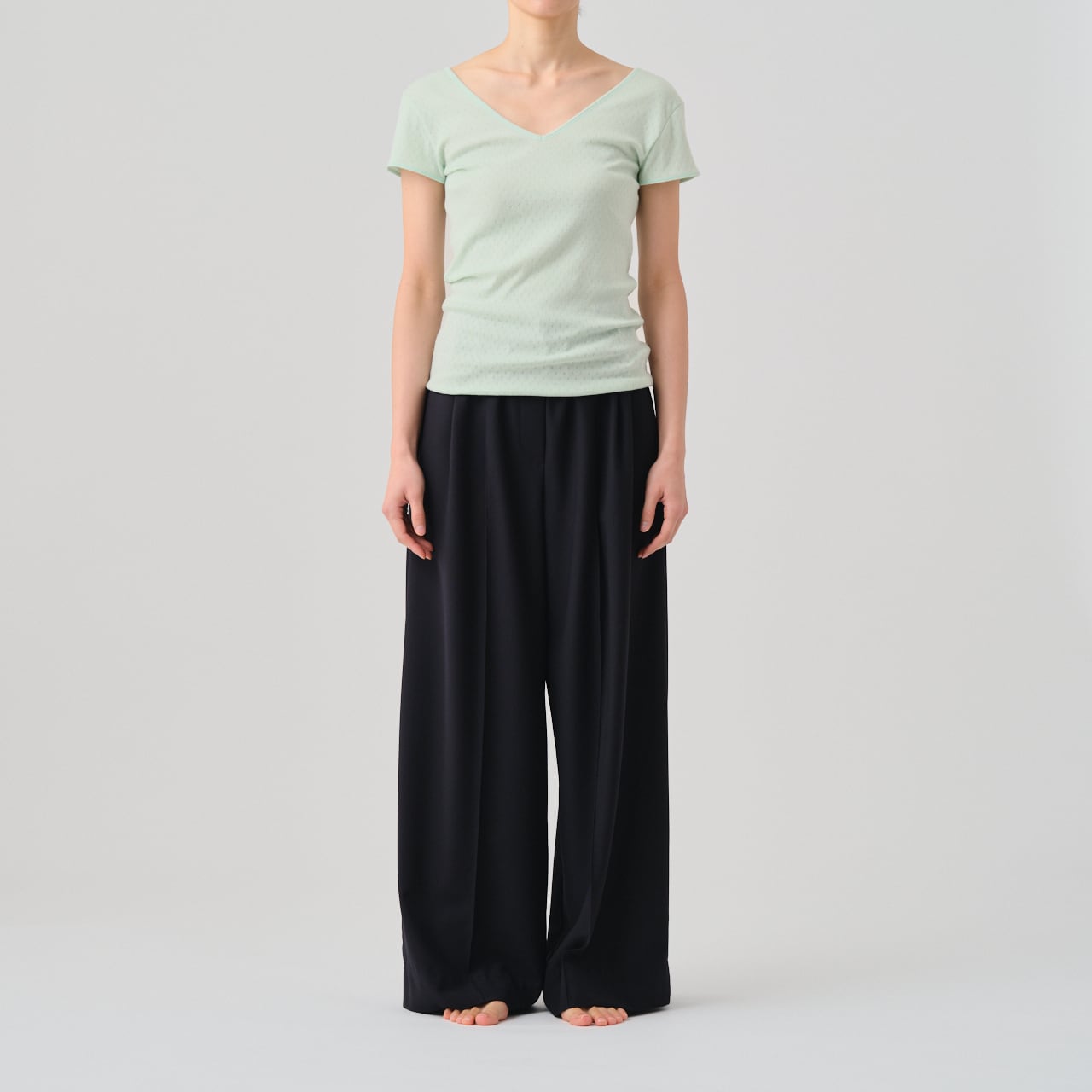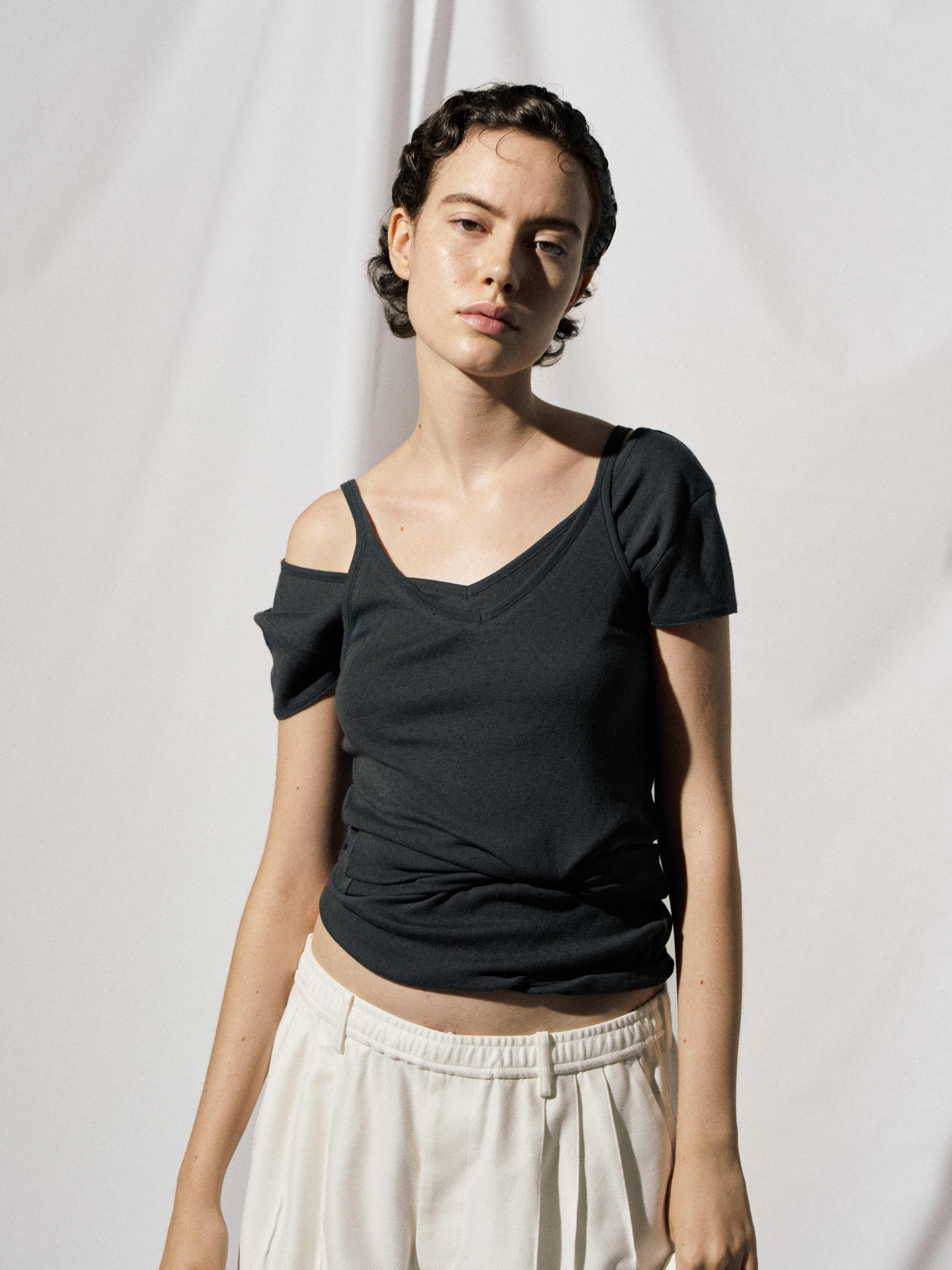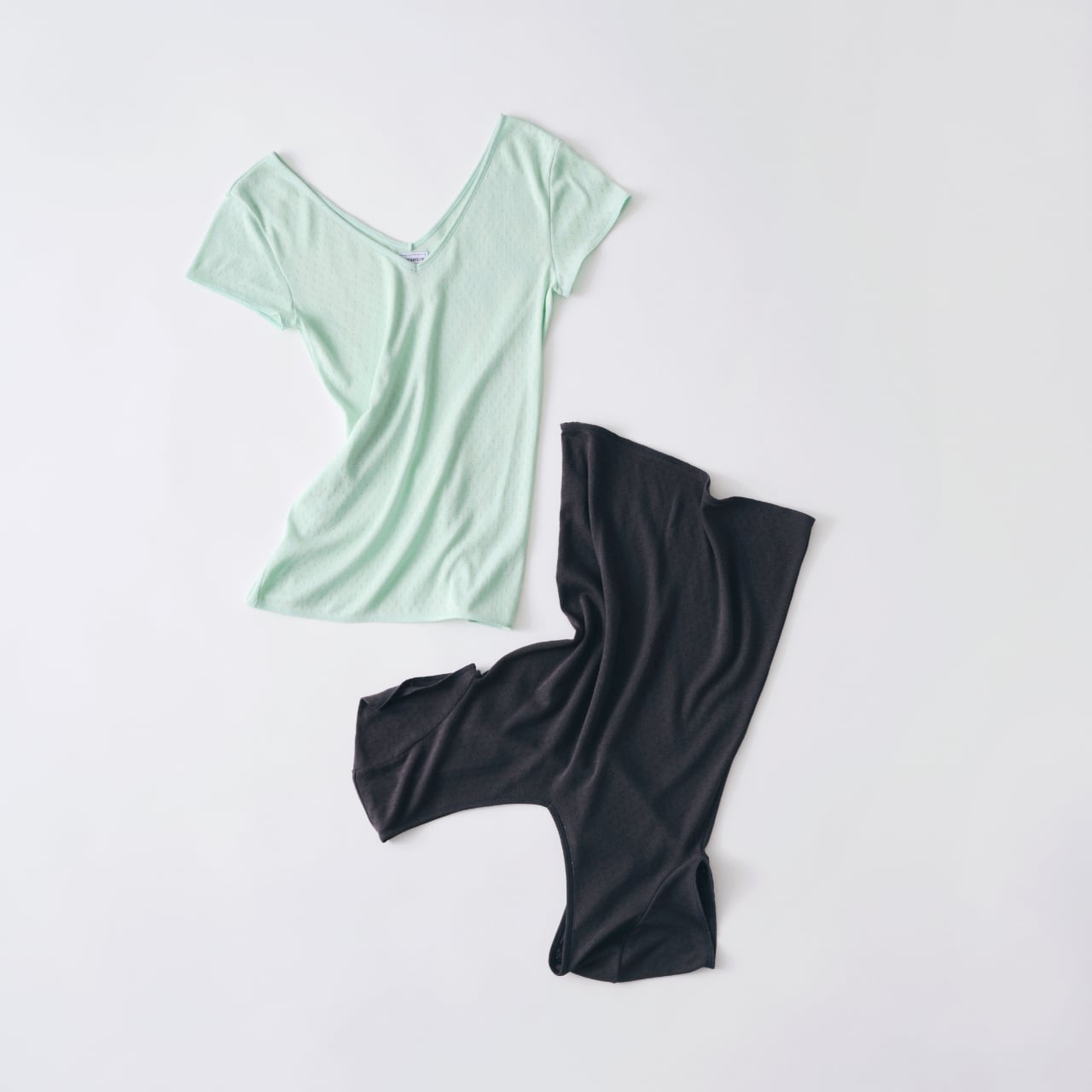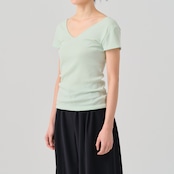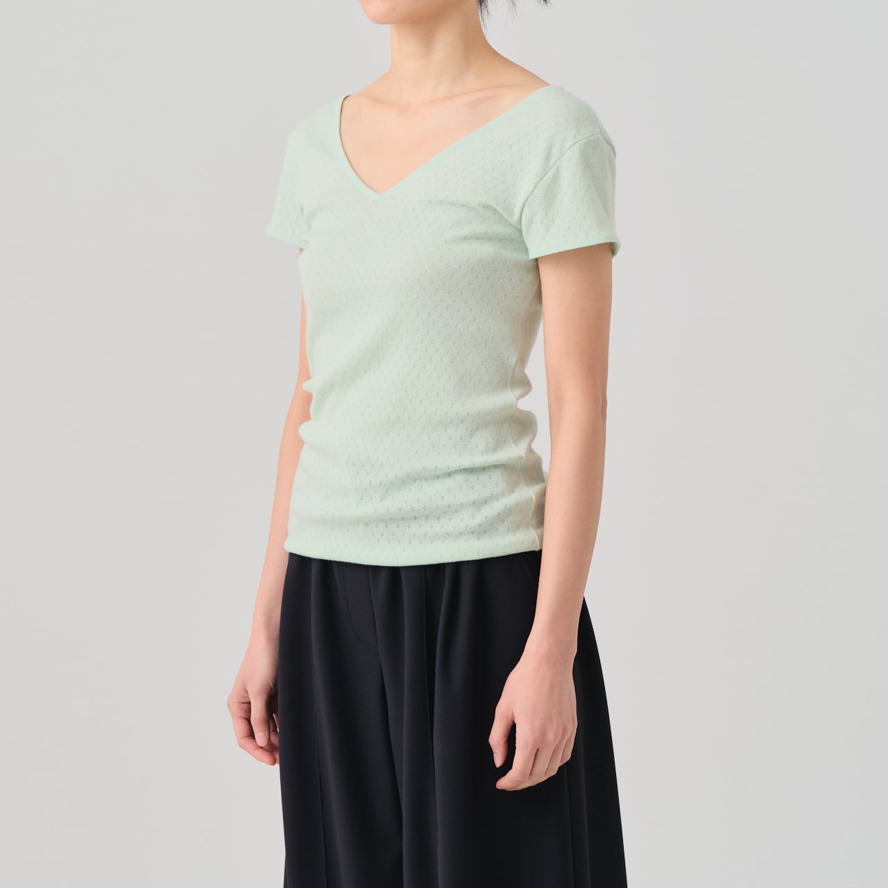 The cap-sleeve T with a retro-style patterned mesh can also be enjoyed as an ensemble with the 02-01-1860 Cotton Silk Double V Neck Camisole made from the same material.