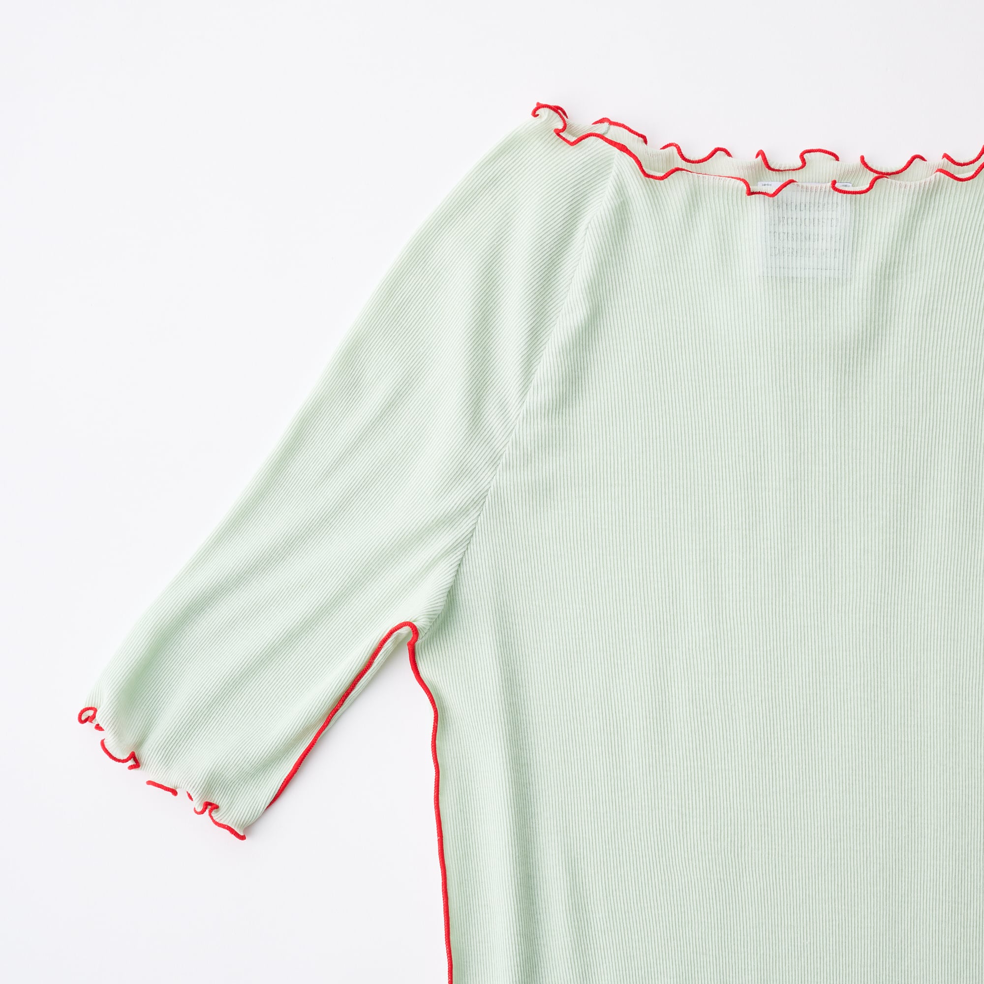 コットン100%透け感のあるリブ素材は、毛羽立ちが少なく、ドライタッチ。それなのに柔らかくてとてもシルキーです。この素材に特別な加工を施し、快適なストレッチ性を持たせ、リブ素材特有の着用後に起きやすいダレを軽減しています。