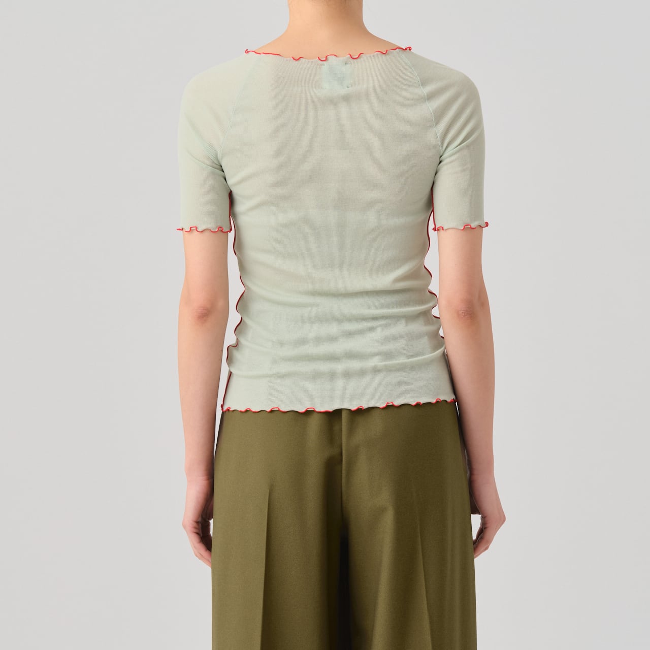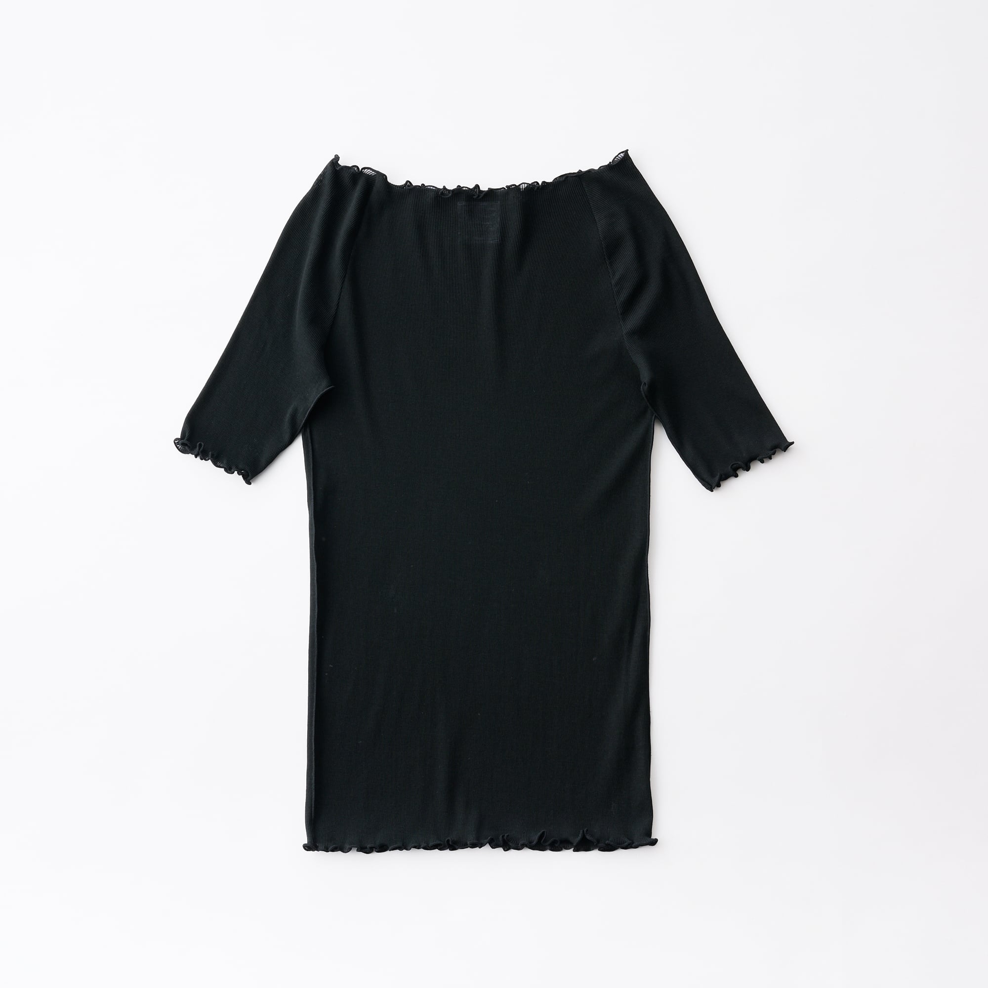 This is a half-sleeve T-shirt featuring a design with delicate, thin ribbing and stitching. Made from 100% cotton, the slightly sheer ribbed fabric has minimal pilling and a dry touch. Despite this, it is soft and very silky. Special processing has been applied to this material to give it comfortable stretch and to reduce the sagging that ribbed fabrics often experience after wearing.