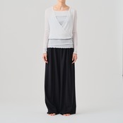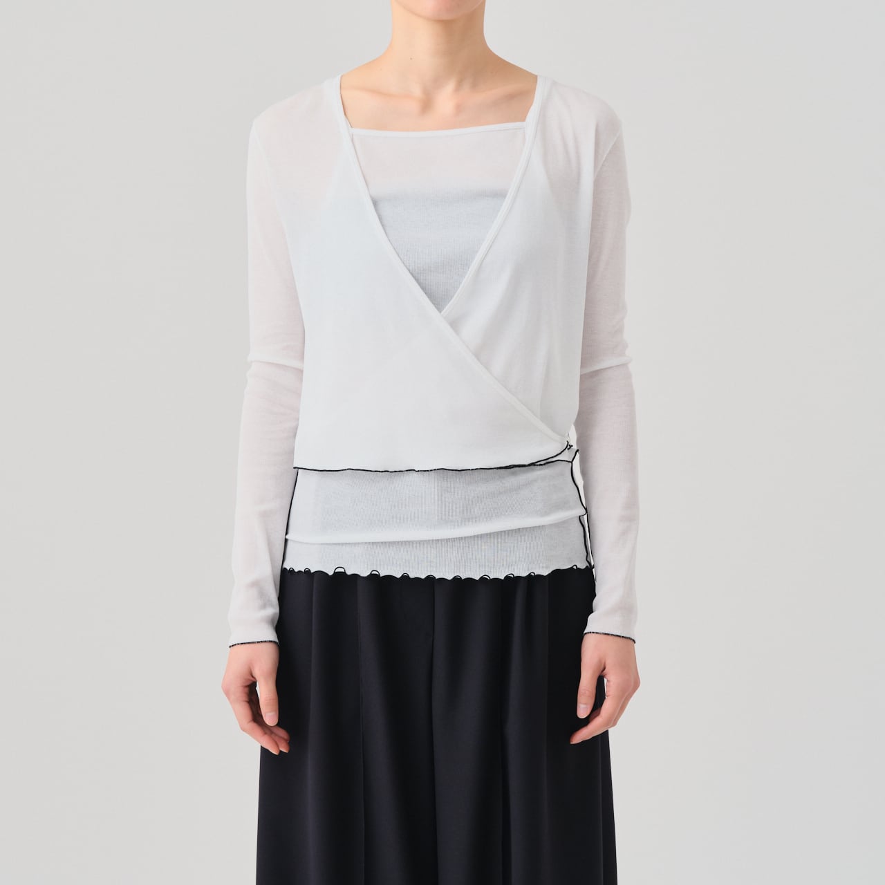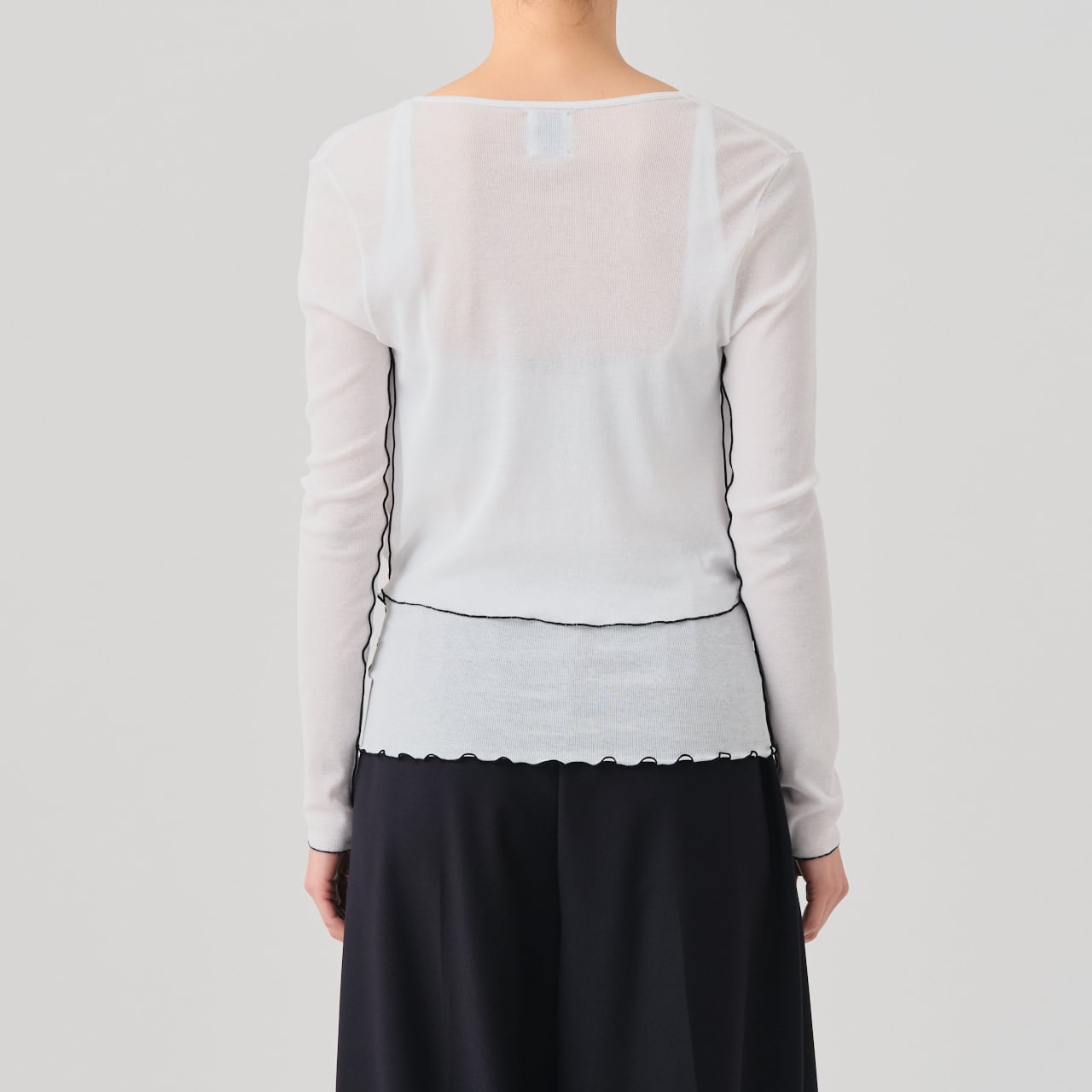 コットン100%透け感のあるリブ素材は、毛羽立ちが少なく、ドライタッチ。それなのに柔らかくてとてもシルキーです。この素材に特別な加工を施し、快適なストレッチ性を持たせ、リブ素材特有の着用後に起きやすいダレを軽減しています。