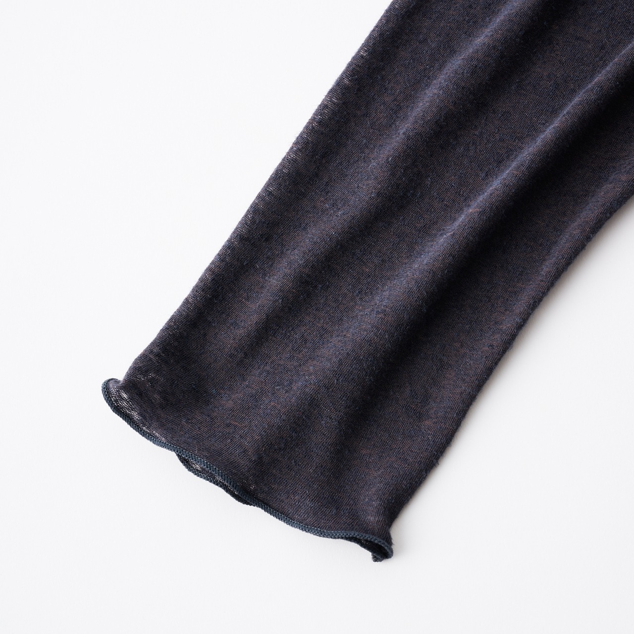 The fabric is knitted from special superfine linen yarn with a polyester core, giving it the natural texture of linen while making it very lightweight and delicate. The polyester core also creates a supple, beautifully draped effect.