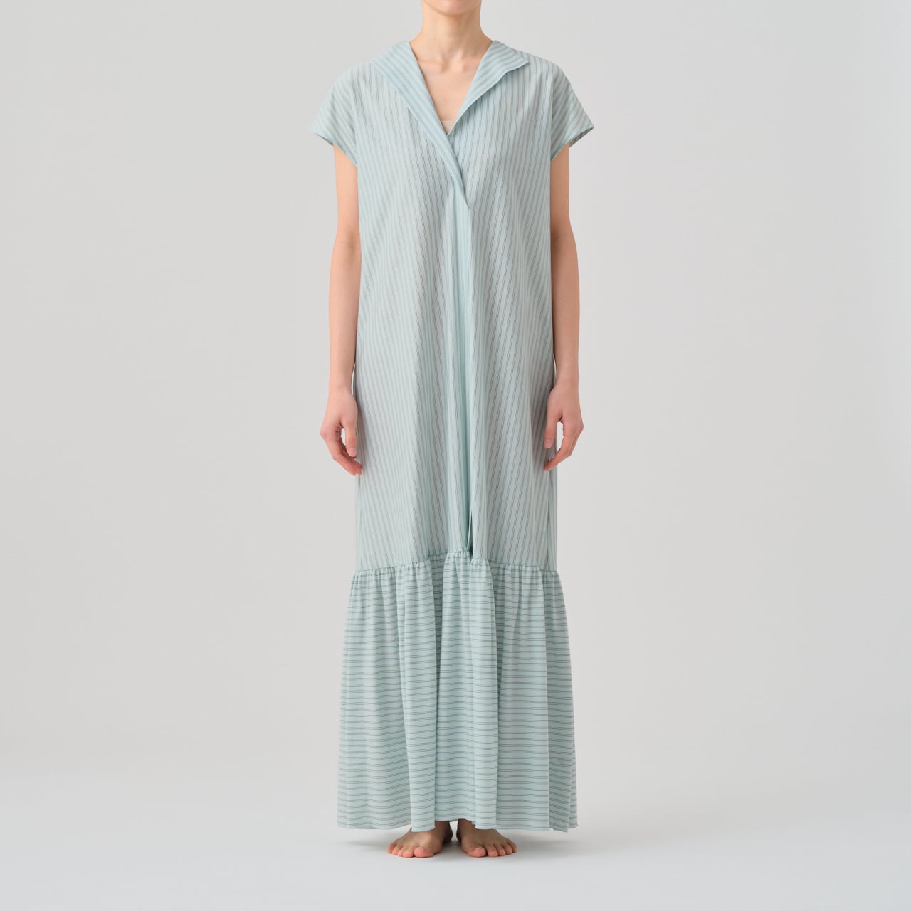 裾にはたっぷりとギャザーを施し、柔らかな揺れと奥行きのあるシルエットのドレスです。
