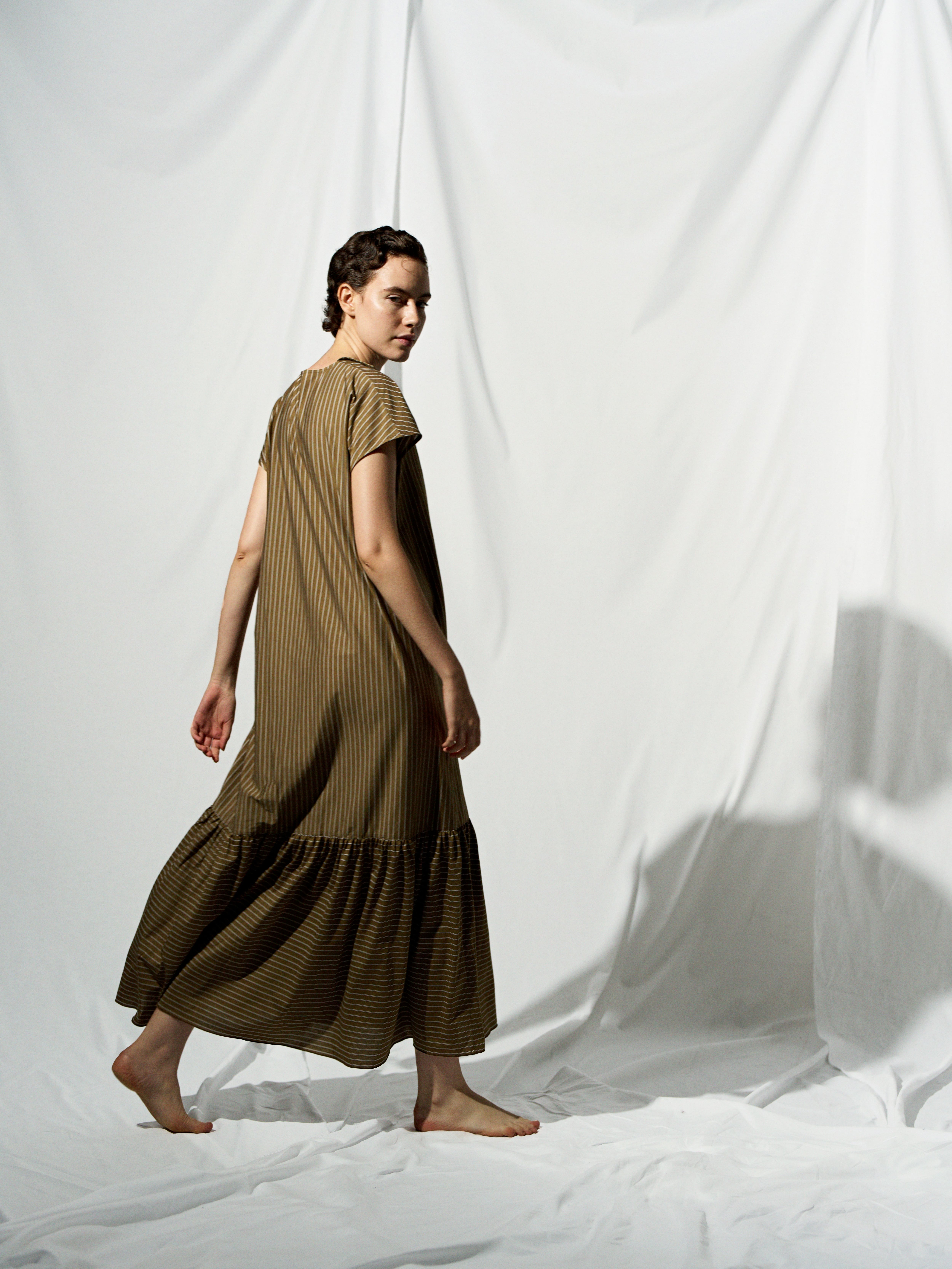 The hem is generously gathered, creating a dress with a soft sway and a dimensional silhouette.