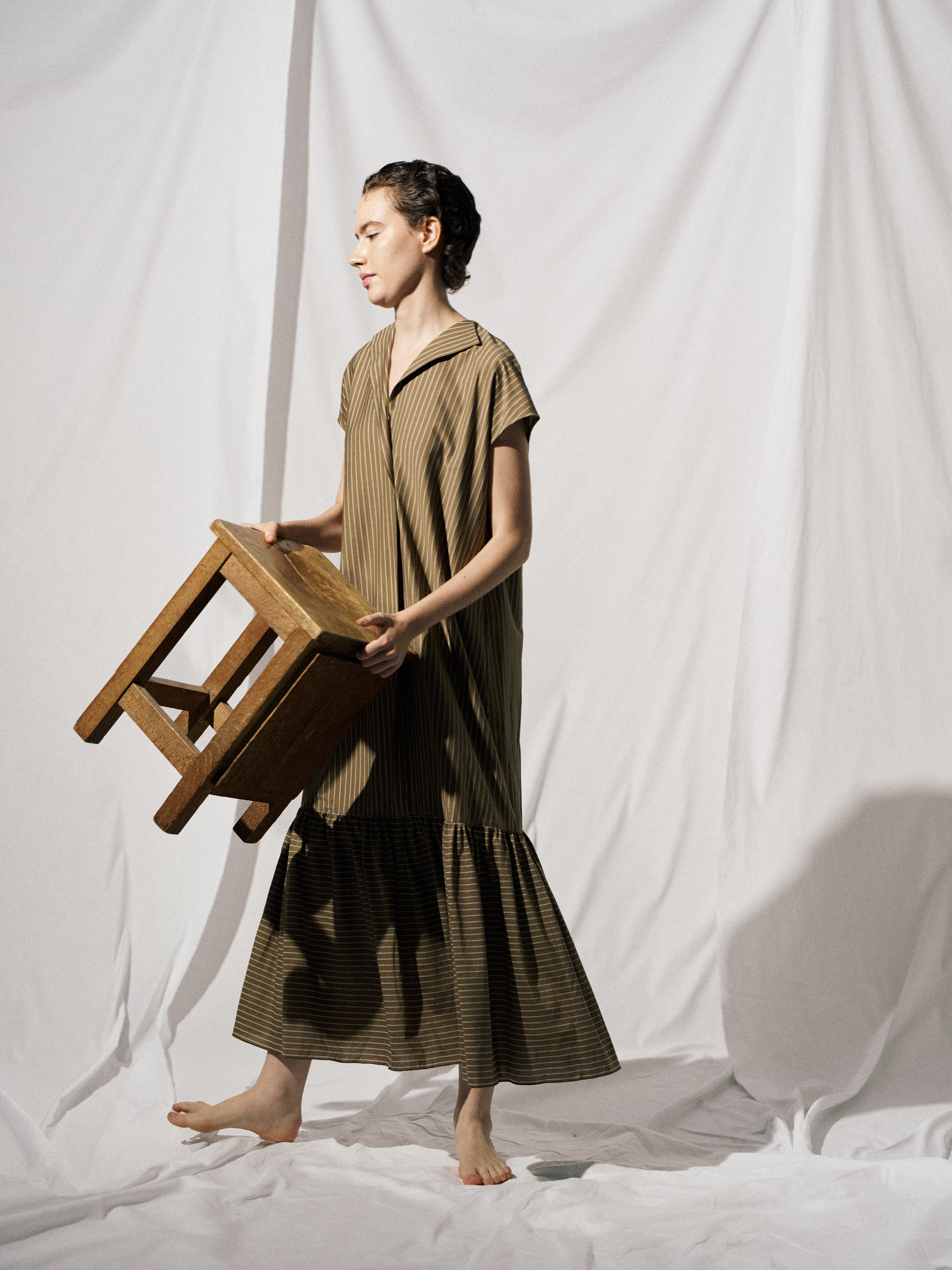 A gathered dress featuring an authentic double stripe pattern.