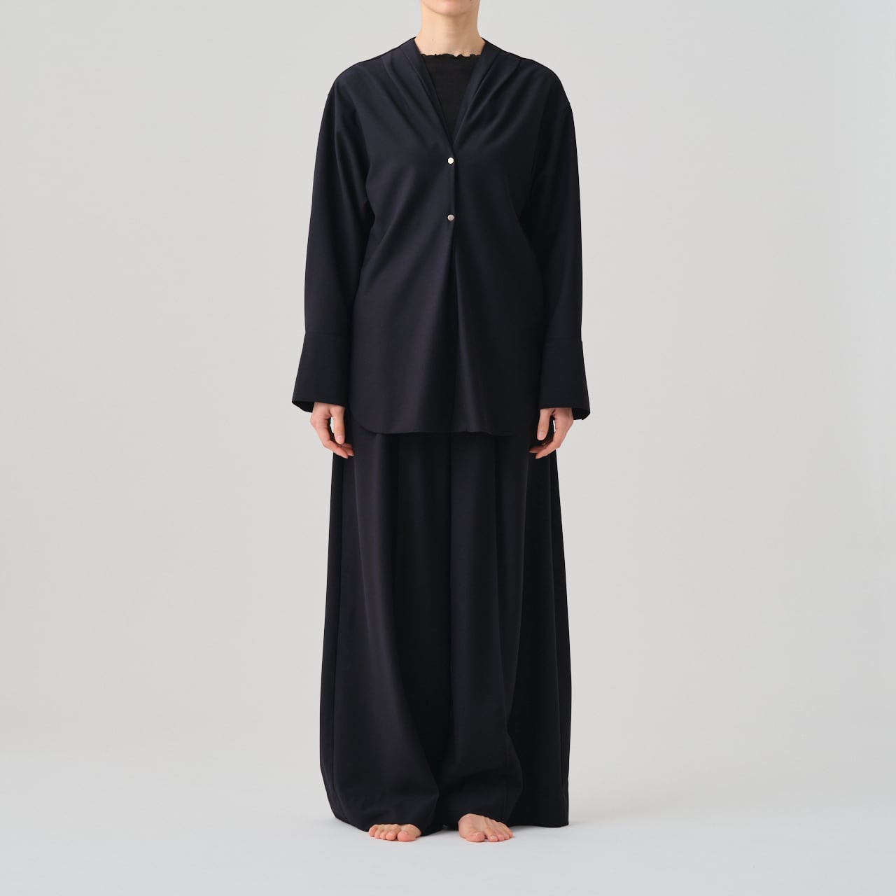 タックを入れたノーカラーに、ミニマルなドットボタンで、全体をクリーンな印象に仕上げています。シャツ感覚で気軽に羽織れるこのイージーシャツジャケットは、02-01-1871 Drawstring Easy Wide Pantsとセットアップとしてもお召しいただけます。