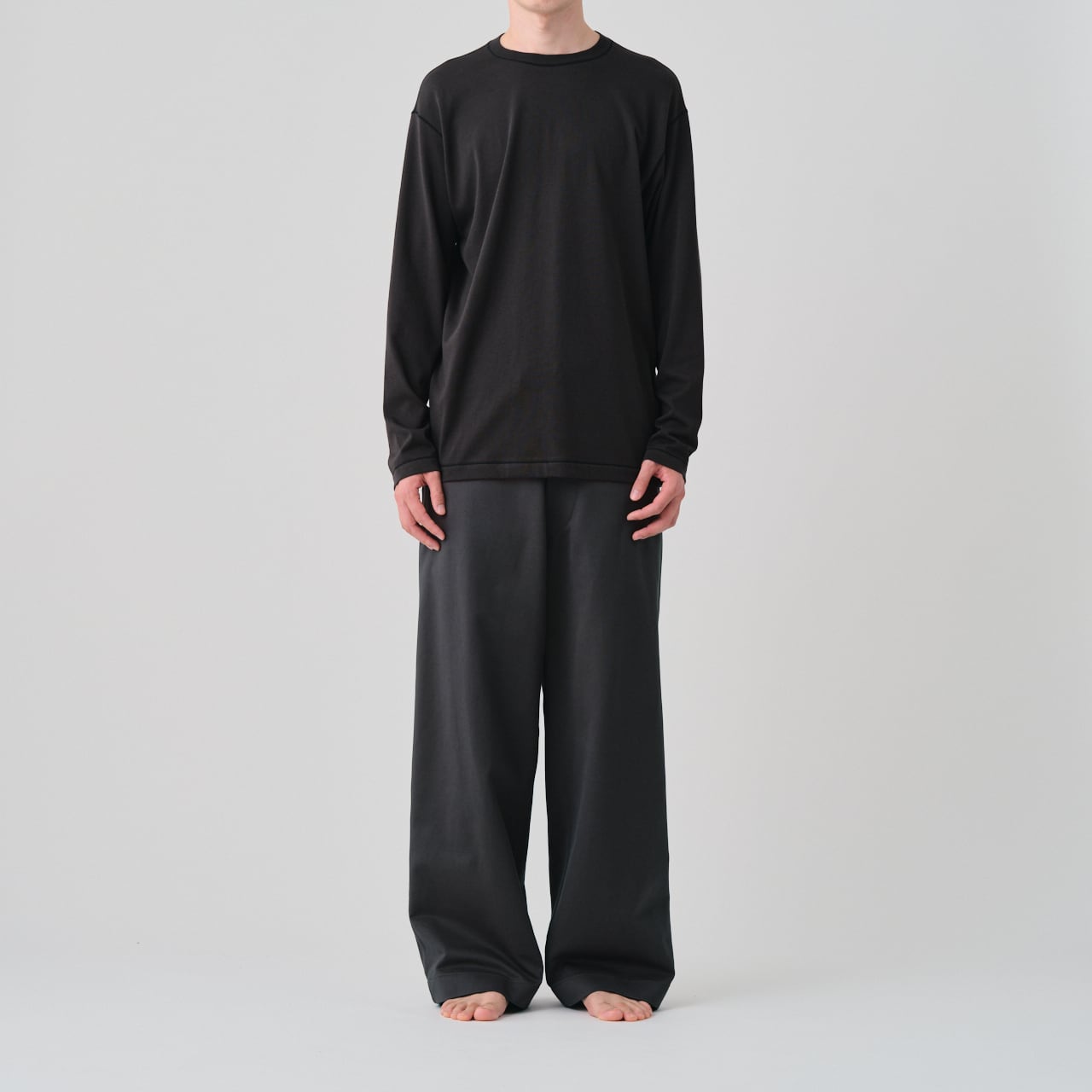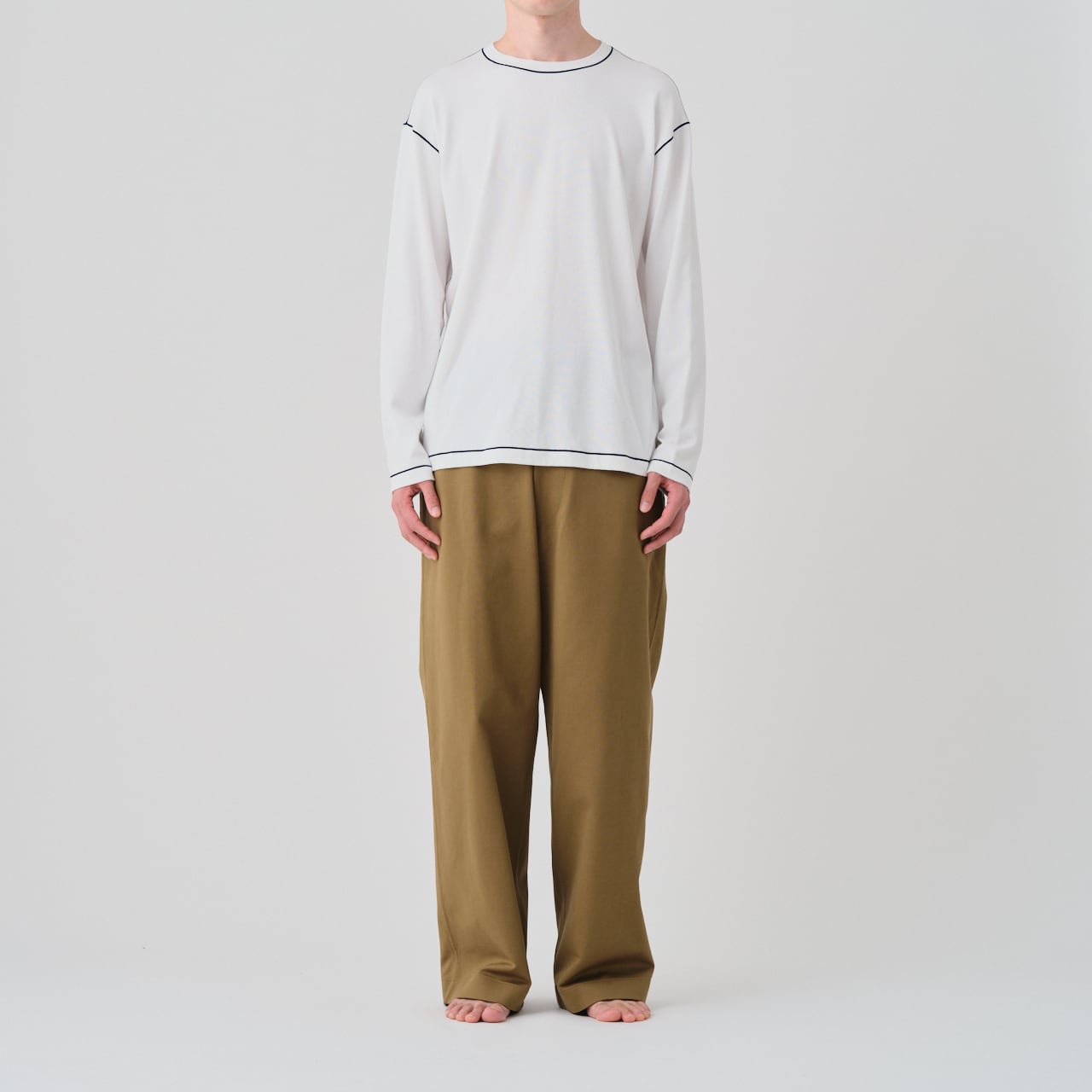 Using a special sewing machine (Mcover®), the fabric is sewn by wrapping the seam allowance necessary for sewing together, resulting in a beautiful finish on both the front and back sides. In order to bring out 100% of the goodness of the material, we minimize the areas that come into direct contact with the skin in pursuit of comfort.